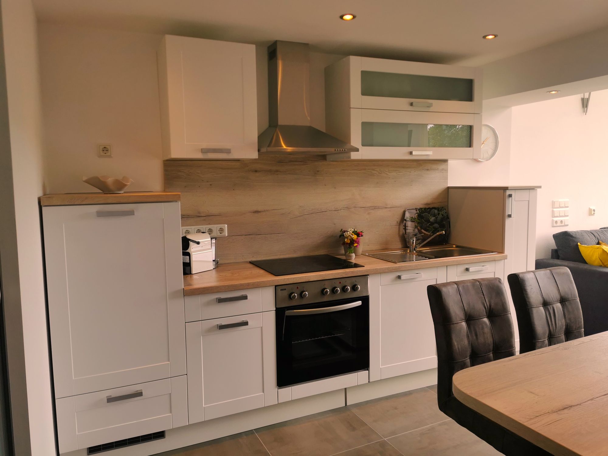 Voll ausgestattete Küchenzeile mit Kühlschrank und Tiefkühlfach, 4-Felder-Induktionskochfeld, Geschirrspüler, Mikrowelle, Kaffeemaschine, Nespresso-Kapselmaschine, Wasserkocher, Eierkocher, Toaster