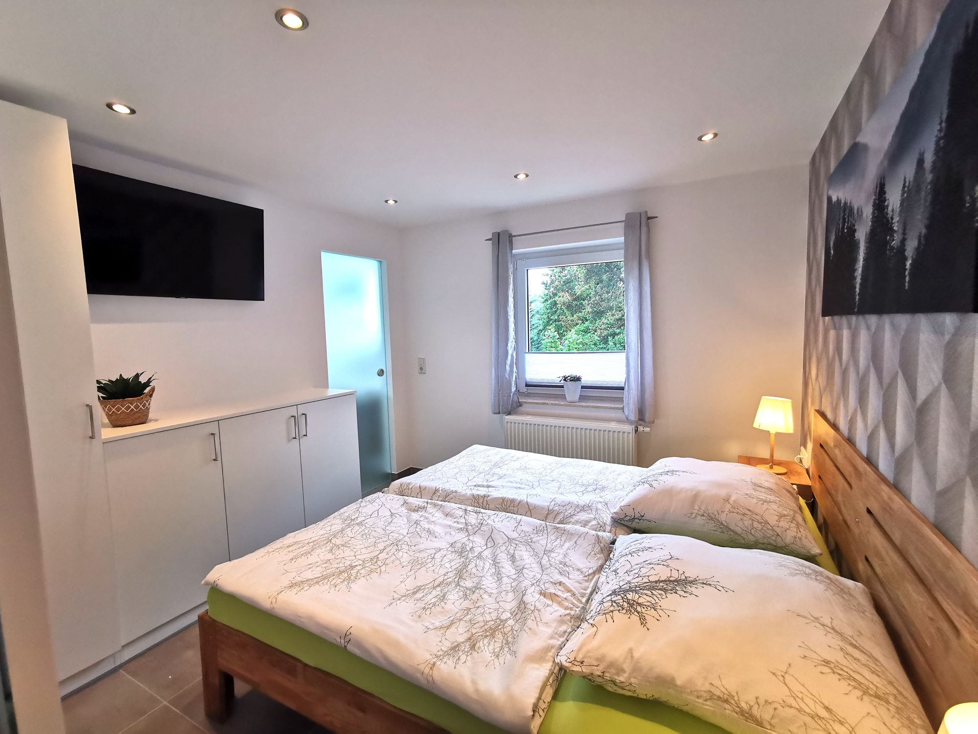 Zwei separate Schlafzimmer mit jeweils einem Doppelbett, zwei Nachttischen, einem Kleiderschrank und einem großen TV-Flachbildschirm.