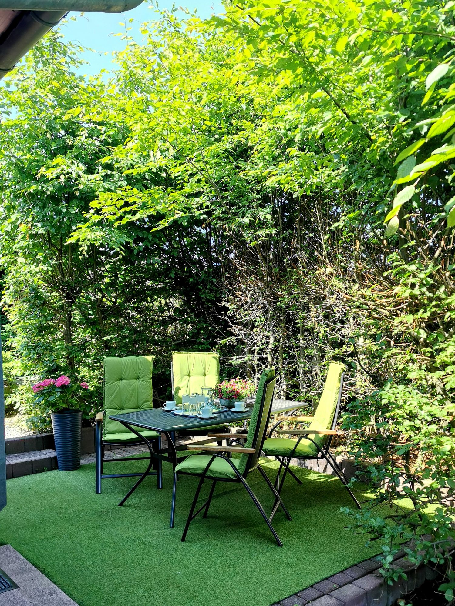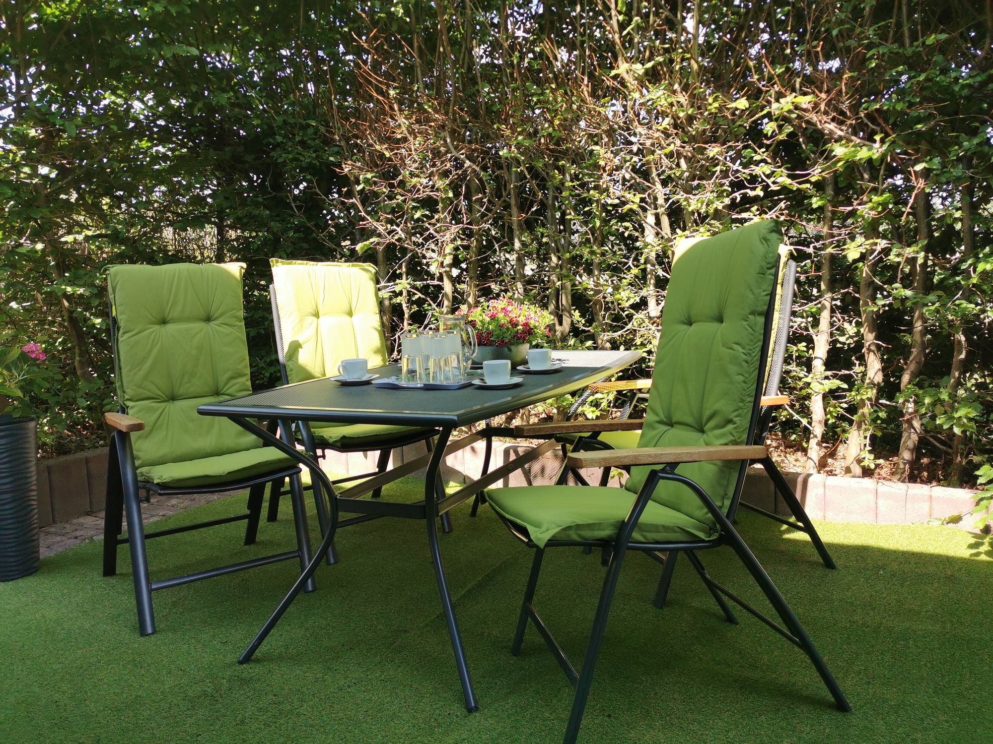 Neben dem Ferienhaus befindet sich ein Gartenbereich mit hochwertigen Gartenmöbeln, Sitzauflagen und ein Holzkohlegrill für entspannte und gemütliche Stunden.