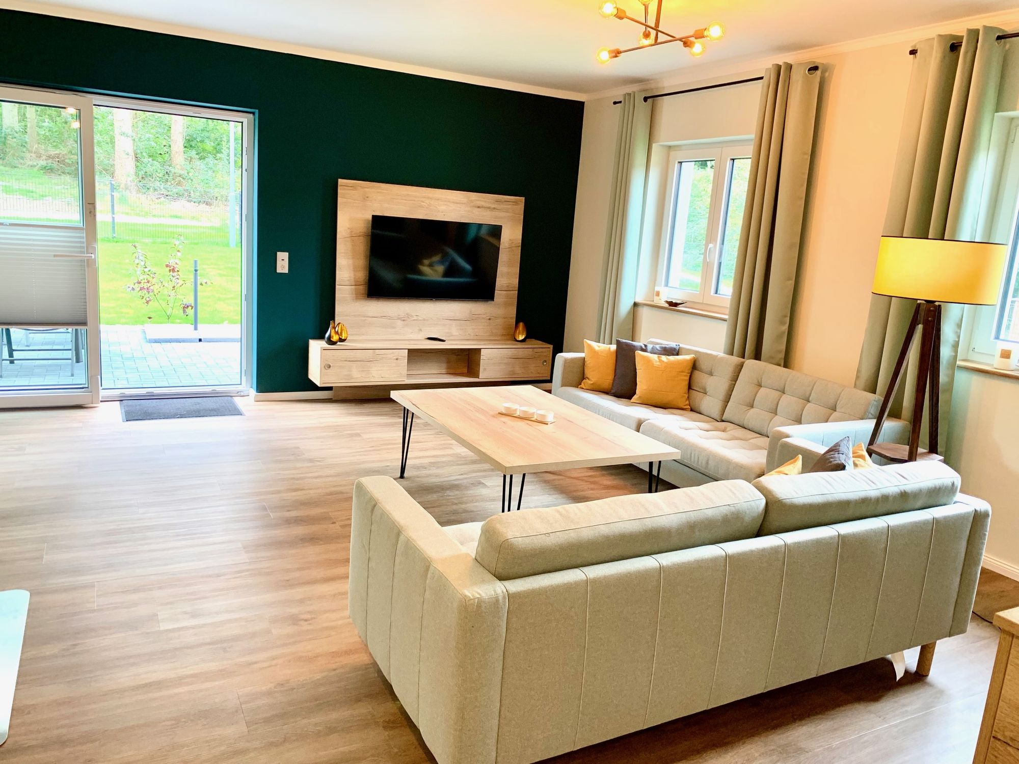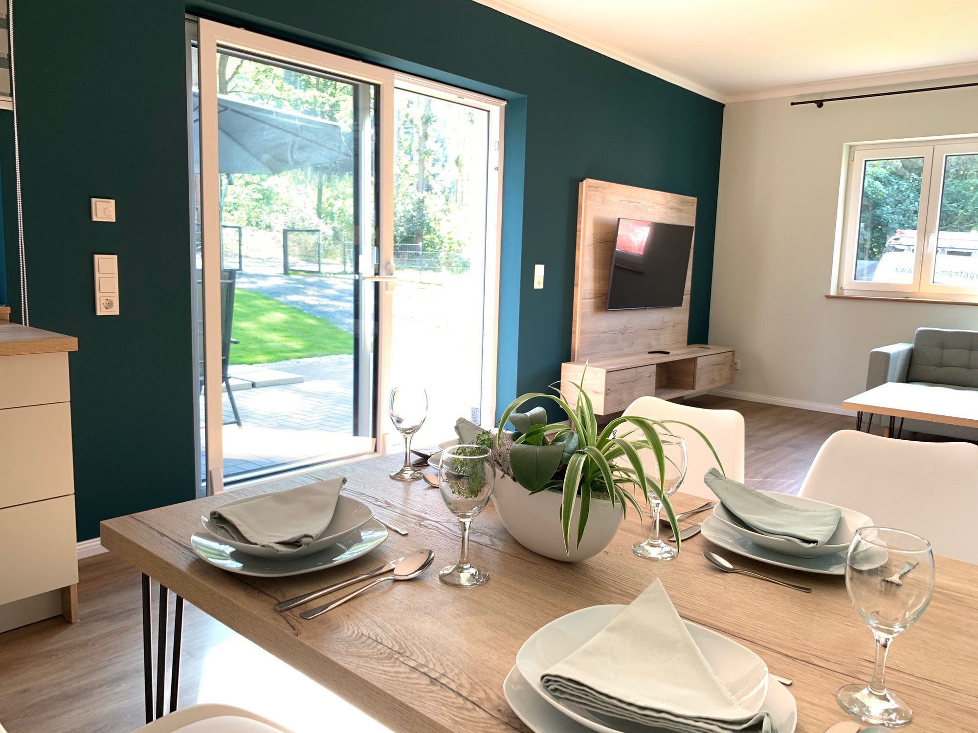 Wohn- und Essbereich mit offener Küche. Zwei gemütliche Sitzgarnituren, TV, Esstisch mit 4 Sitzplätzen.