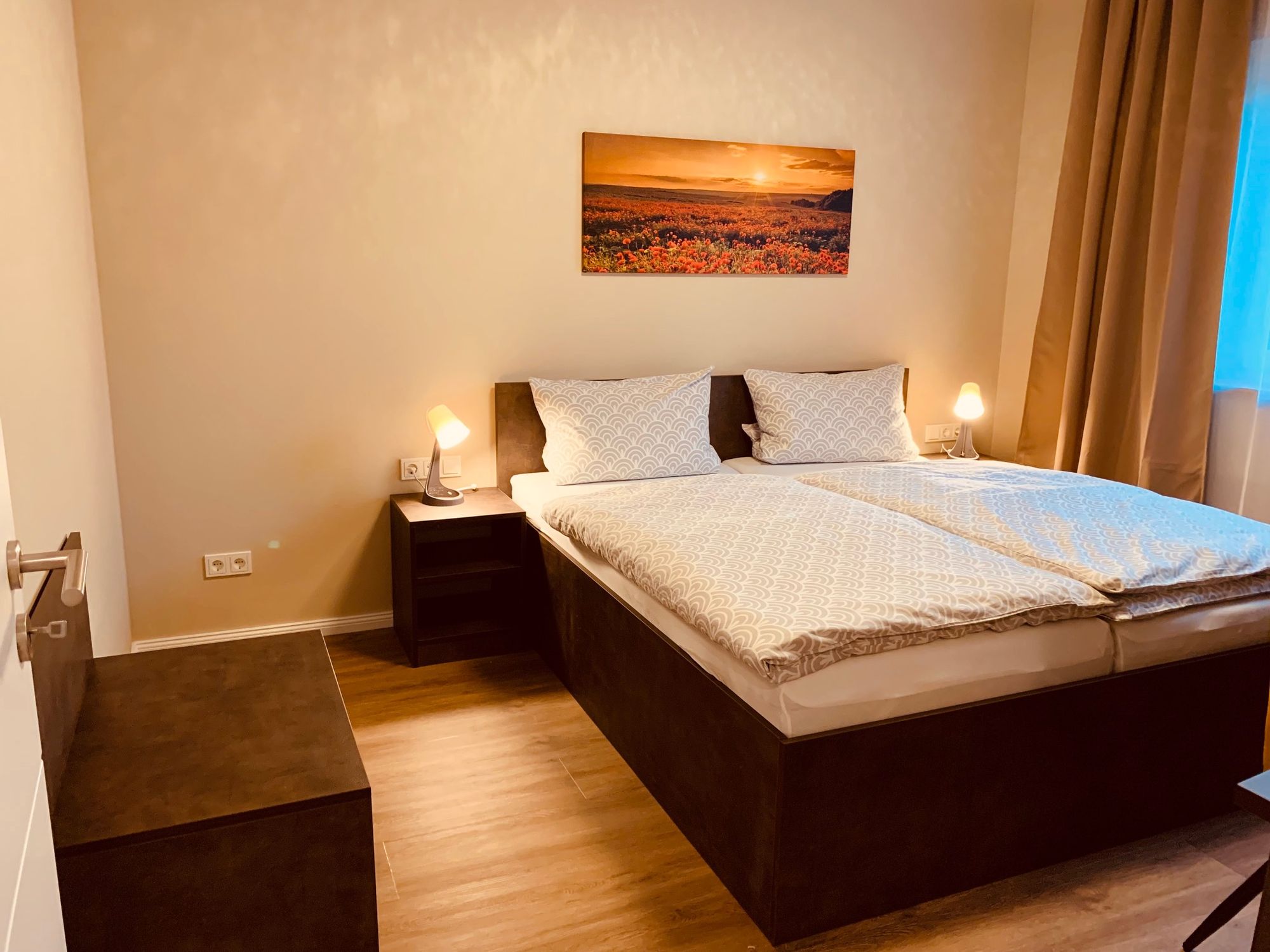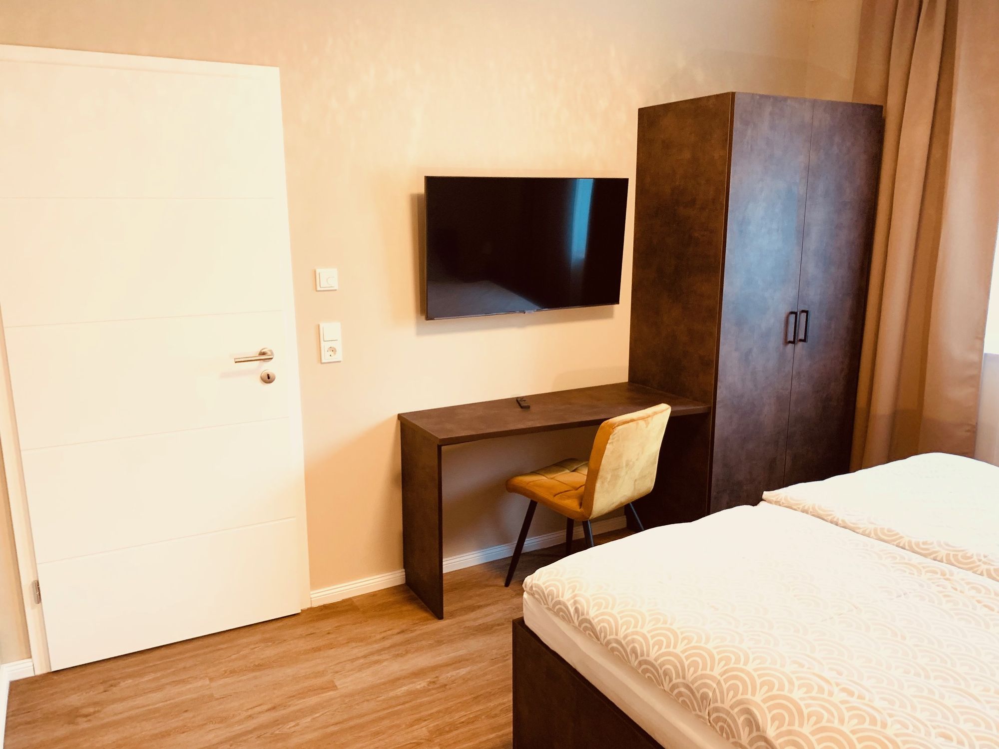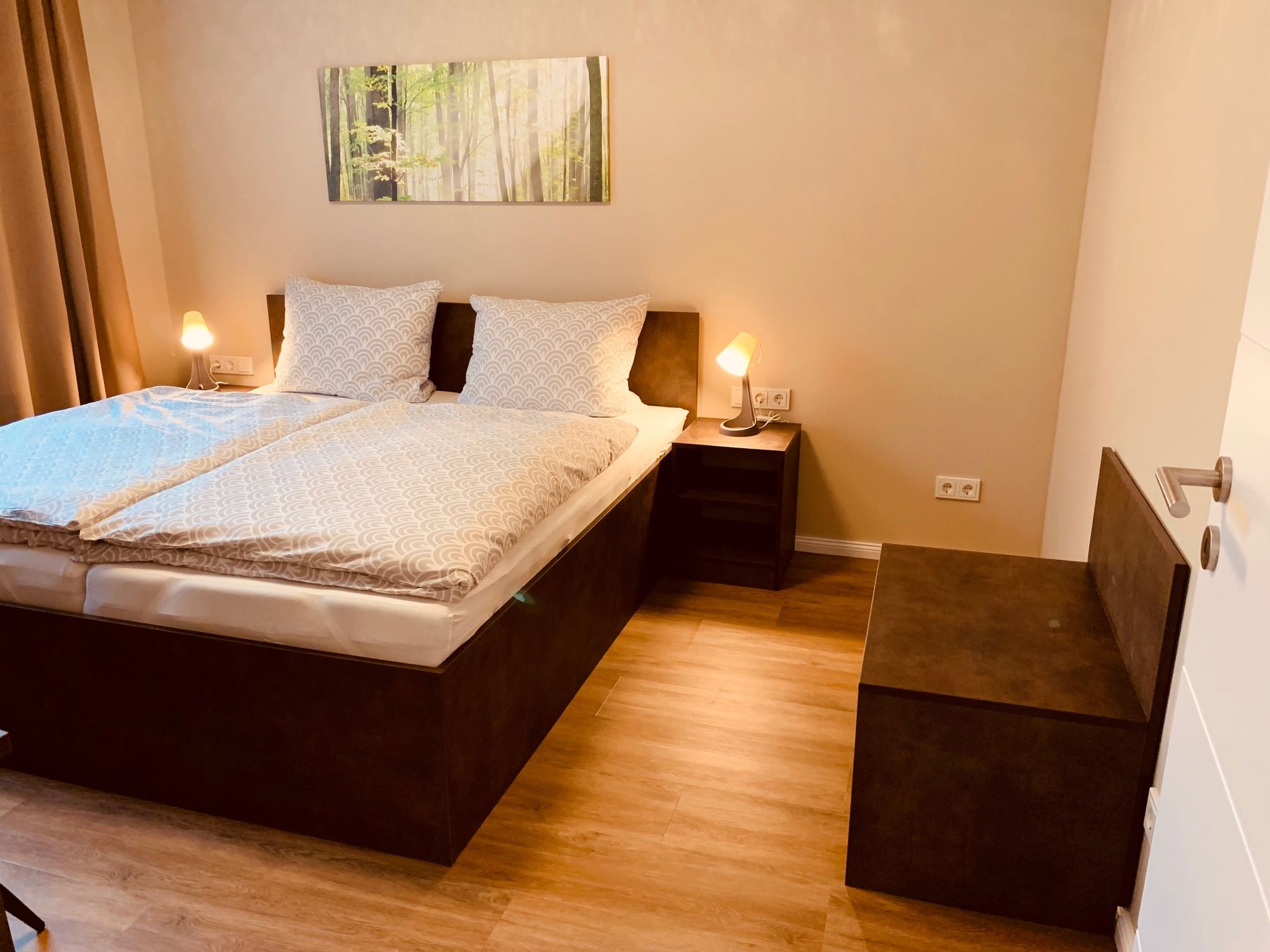 Zwei Schlafzimmer jeweils mit Doppelbett, Kleiderschrank, Sitzbank aus Holz, kleiner Schreibtisch mit Stuhl, Fernseher.