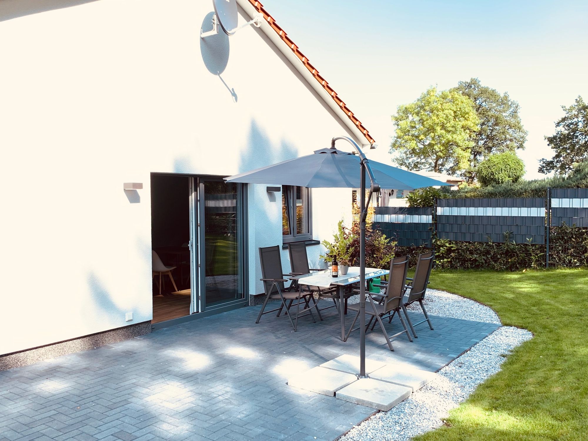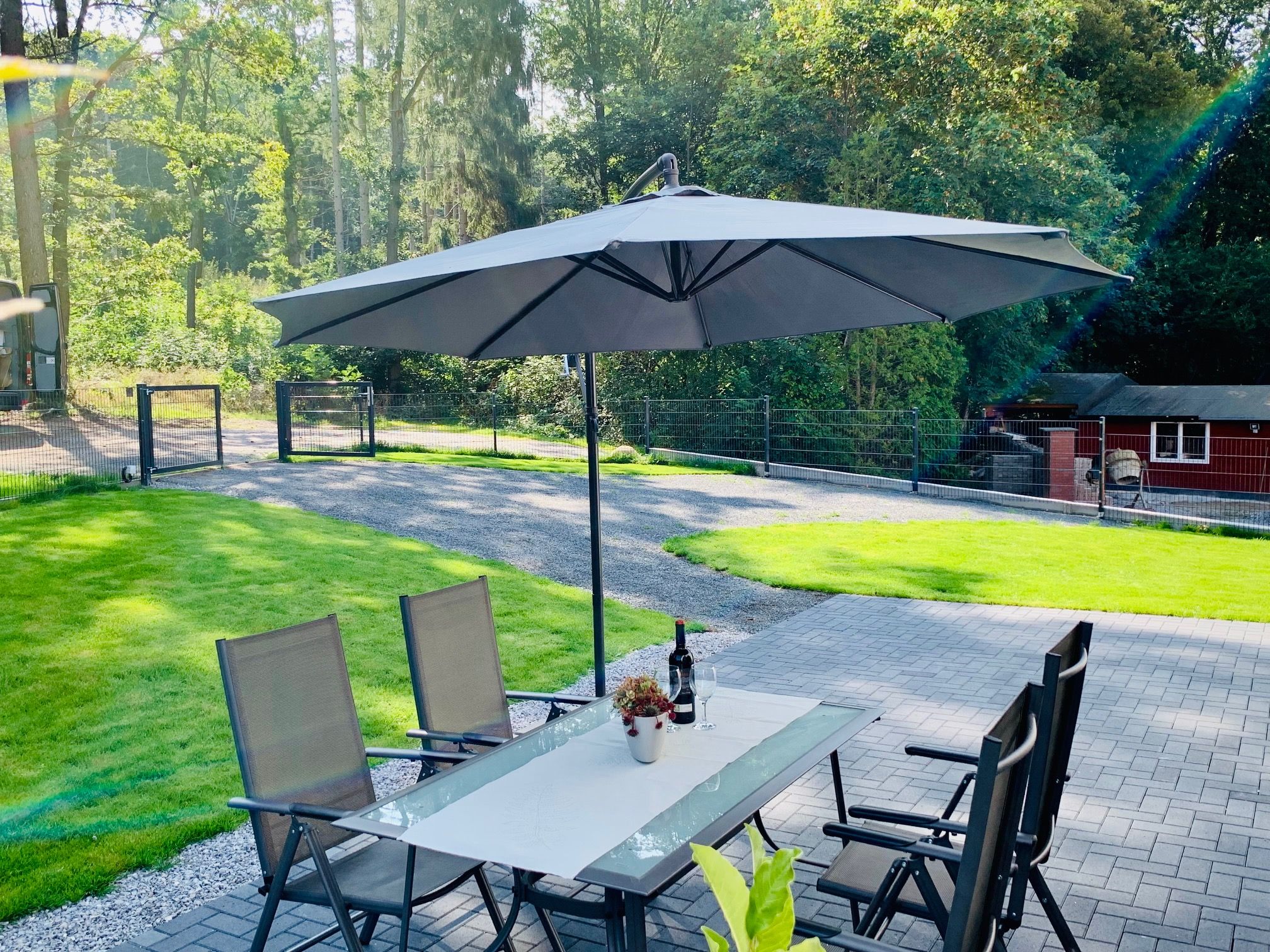 Terrasse in Richtung Waldrand mit Sitzmöglichkeiten, Sonnenschirm und Möglichkeiten zur Nutzung eines Grills.