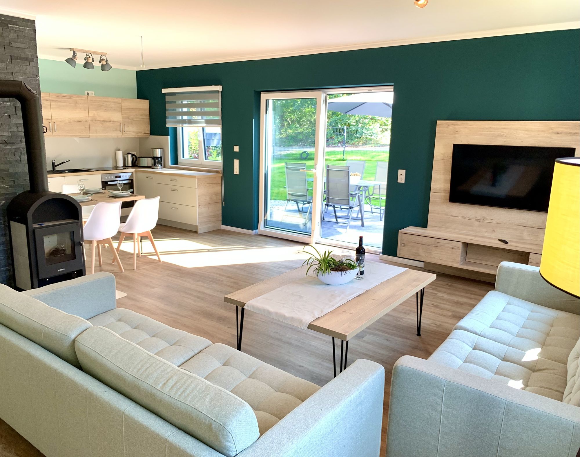 Im Ferienhaus finden Sie hochwertige Holzelemente und warme Farben, die im Sommer freundlich wirken und im Winter ein wohliges Gefühl der Geborgenheit vermitteln. In den kalten Monaten können Sie zusätzlich ein prasselndes Feuer im Kaminofen entzünden. Die beiden Schlafzimmer ermöglichen Ihnen entspannte Nächte. Vielleicht helfen Ihnen ein guter Film oder der Tagesrückblick beim Einschlafen.