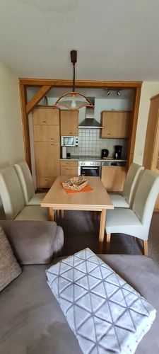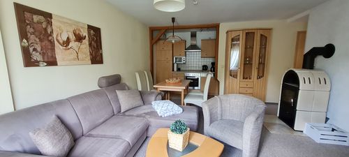 Großer, offener Wohn- und Kochbereich mit gemütlicher Sitzecke, Esstisch mit 4 Stühlen und voll ausgestatteter Küche (4-Felder-Cerankochfeld, Backofen, Kühlschrank mit Gefrierfach, Mikrowelle, Geschirrspüler, Kaffeemaschine, Toaster)