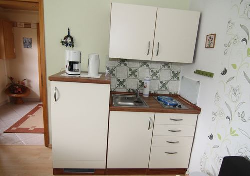 Küchenzeile mit Kühlschrank, 2-Platten-Herd, Toaster, Mikrowelle und Kaffeemaschine