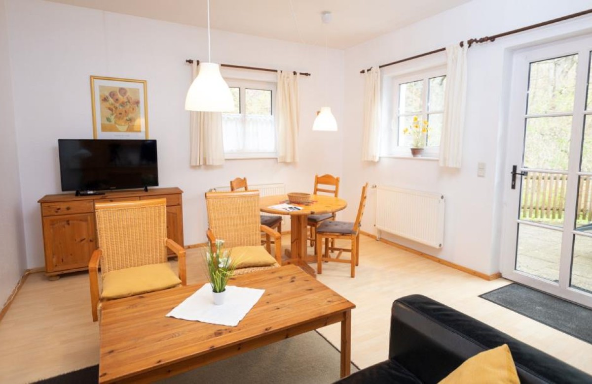Wohn-, Koch- und Essbereich mit Sitzmöglichkeiten, Fernseher mit SAT TV, Sofa, Telefon, Radio mit CD-Player, Esstisch (entsprechend der maximalen Gästezahl)