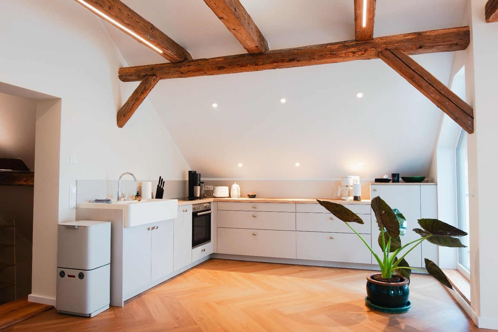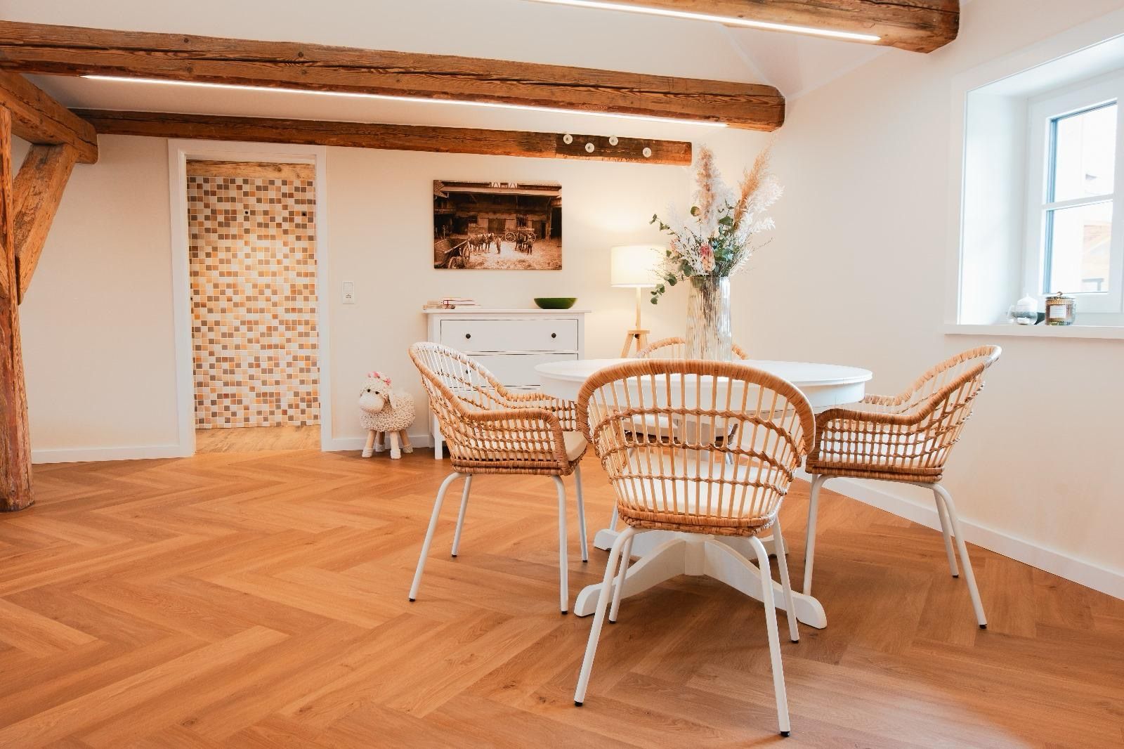 Offene Wohnküche mit gemütlichem Essbereich (4 Sitzplätze) und einer modernen, voll ausgestatteten Küche (4-Felder-Cerankochfeld, Backofen, Kühlschrank, Kaffeemaschine, Wasserkocher. Toaster, SodaStream-Wassersprudler)