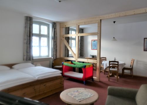 Wohn- und Schlafbereich mit Sitzecke, TV, einem Doppelbett und einem Einzelbett;