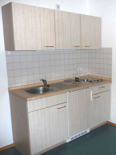 kleine Miniküche mit Kühlschrank, zwei Kochplatten und Abwaschbecken