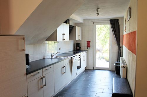 Voll ausgestattete Küche mit 4-Felder-Cerankochherd, Backofen, Kühlschrank, Mikrowelle, Geschirrspüler, Wasserkocher, Kaffee- und Teemaschine, Toaster