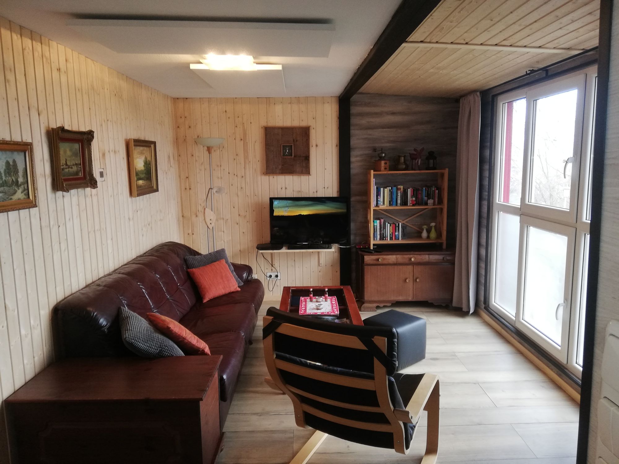 Wohnzimmer mit integrierter Wohnküche (E-Kamin, Kabel Fernsehen mit Entertainfunktion, WLAN, Radio, CD-Player, 4-Felder-Elektroherd mit Umluft-Backofen, Kaffeemaschine, Wasserkocher, Toaster, Kühlschrank mit Gefrierfach)