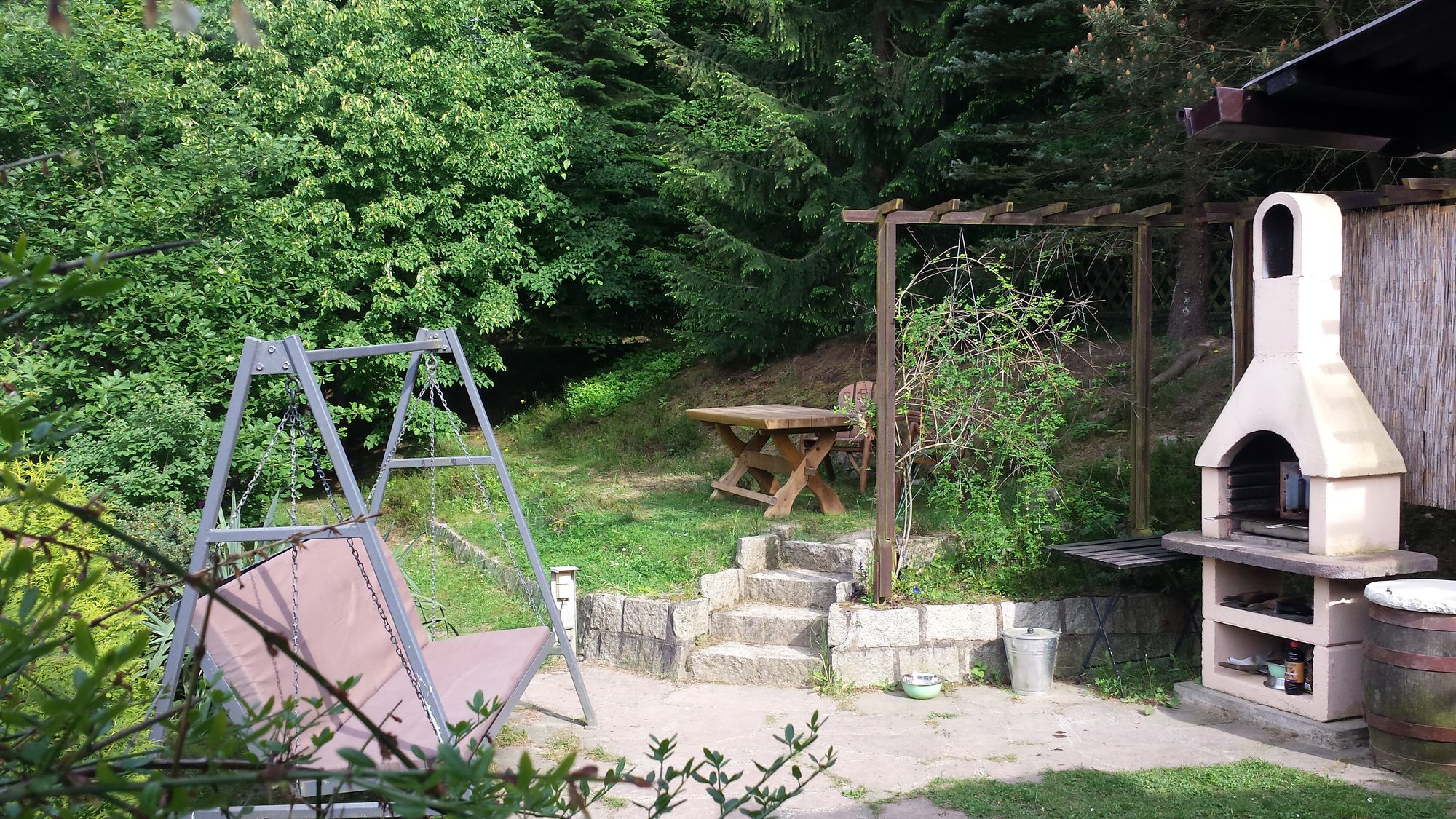 Auf dem 600 qm großen Außengelände können Sie sich unbeobachtet bewegen, den vorhandenen Grillkamin nutzen und einfach zur Entspannung unter der alten Eiche dem Gezwitscher der Vögel lauschen.