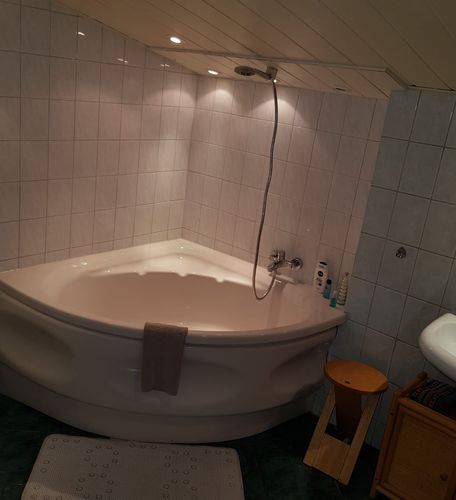 Bad mit großer Eckbadewanne mit Duschfunktion und WC