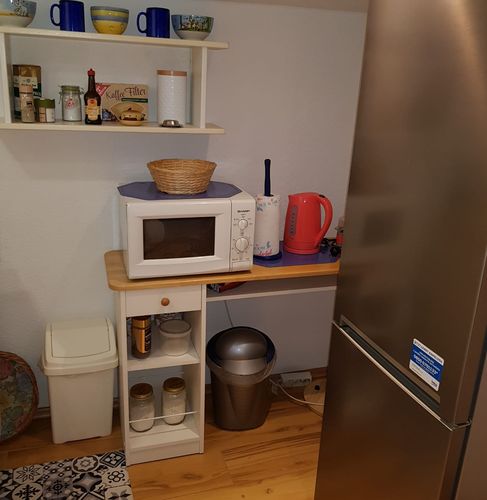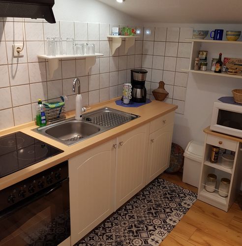Voll ausgestattete Küche mit 4-Felder-Ceranherd, Backofen, Kühlschrank, Mikrowelle, Kaffeemaschine, Wasserkocher