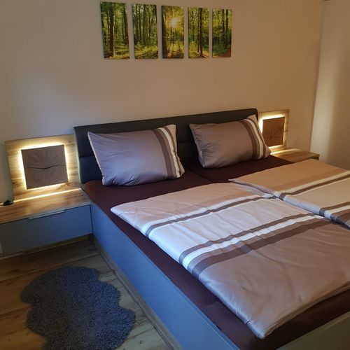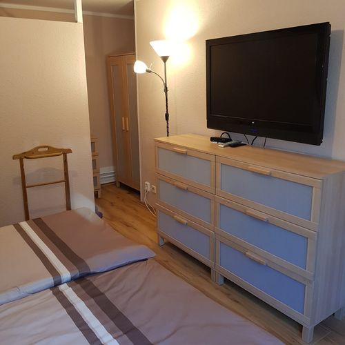 Schlafzimmer mit Doppelbett und Flachbild-Fernseher