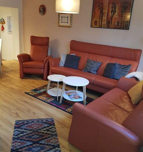 Wohn- und Esszimmer mit Ledercouch, Esstisch mit 4 Stühlen, großer Flachbild-Fernseher