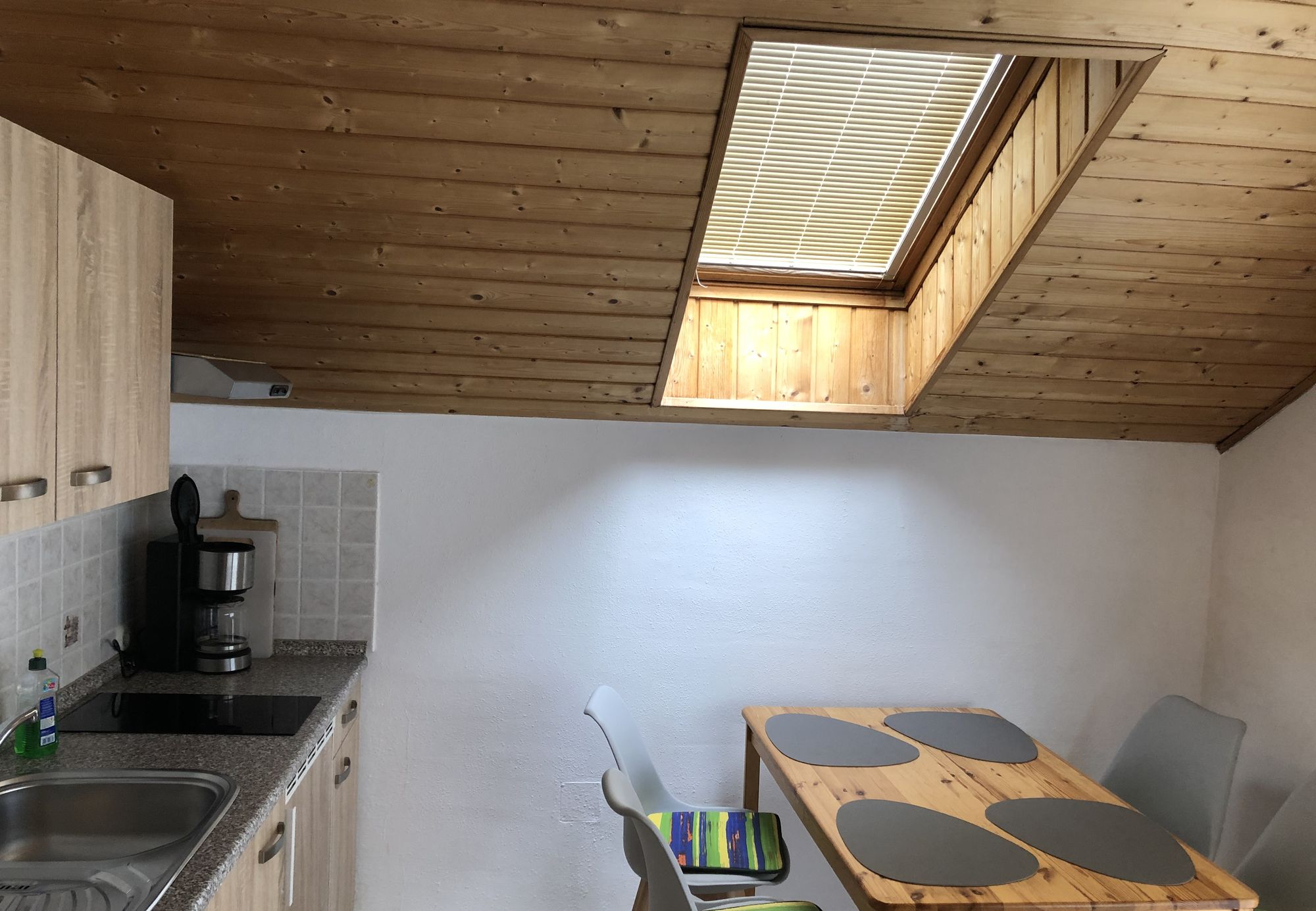 Kochnische (2-Felder-Herd, Kühlschrank mit kleinem Gefrierfach, Kaffeemaschine) mit Essbereich (4 Sitzplätze)