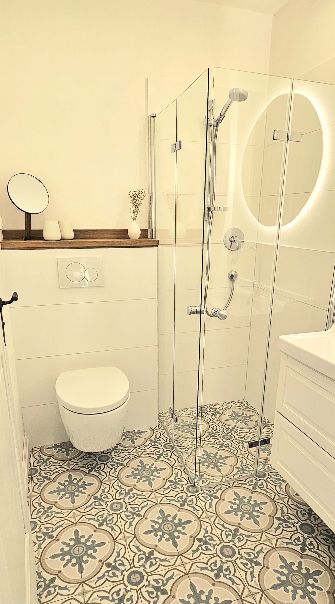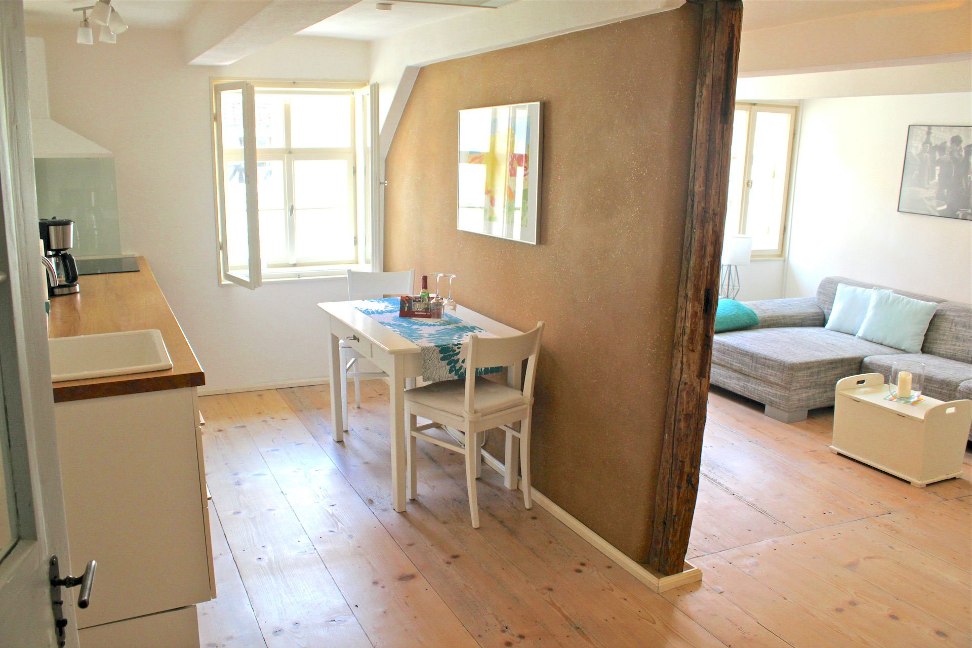 Die Küche, mit einer separierten Kochinsel und dem, mit Ornamenten überzogenen Fliesenboden, hat einen ganz speziellen Charme. Gemeinsames Kochen in Familie oder mit Freunden wird hier zum Erlebnis. Die Ausblicke über die Hausdächer regen die Sinne an. Die modernen Bäder der Ferienwohnungen sind mit ebenerdigen Duschen und Fußbodenheizung ausgestattet.
