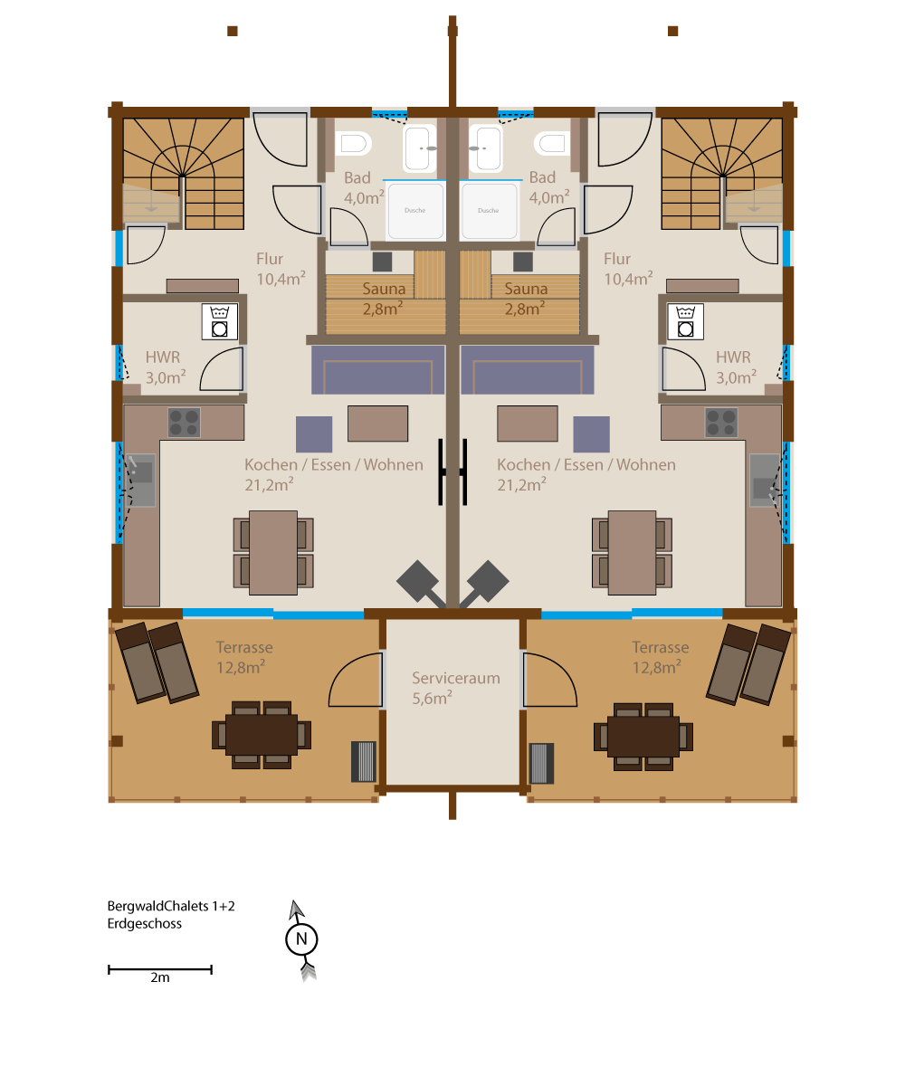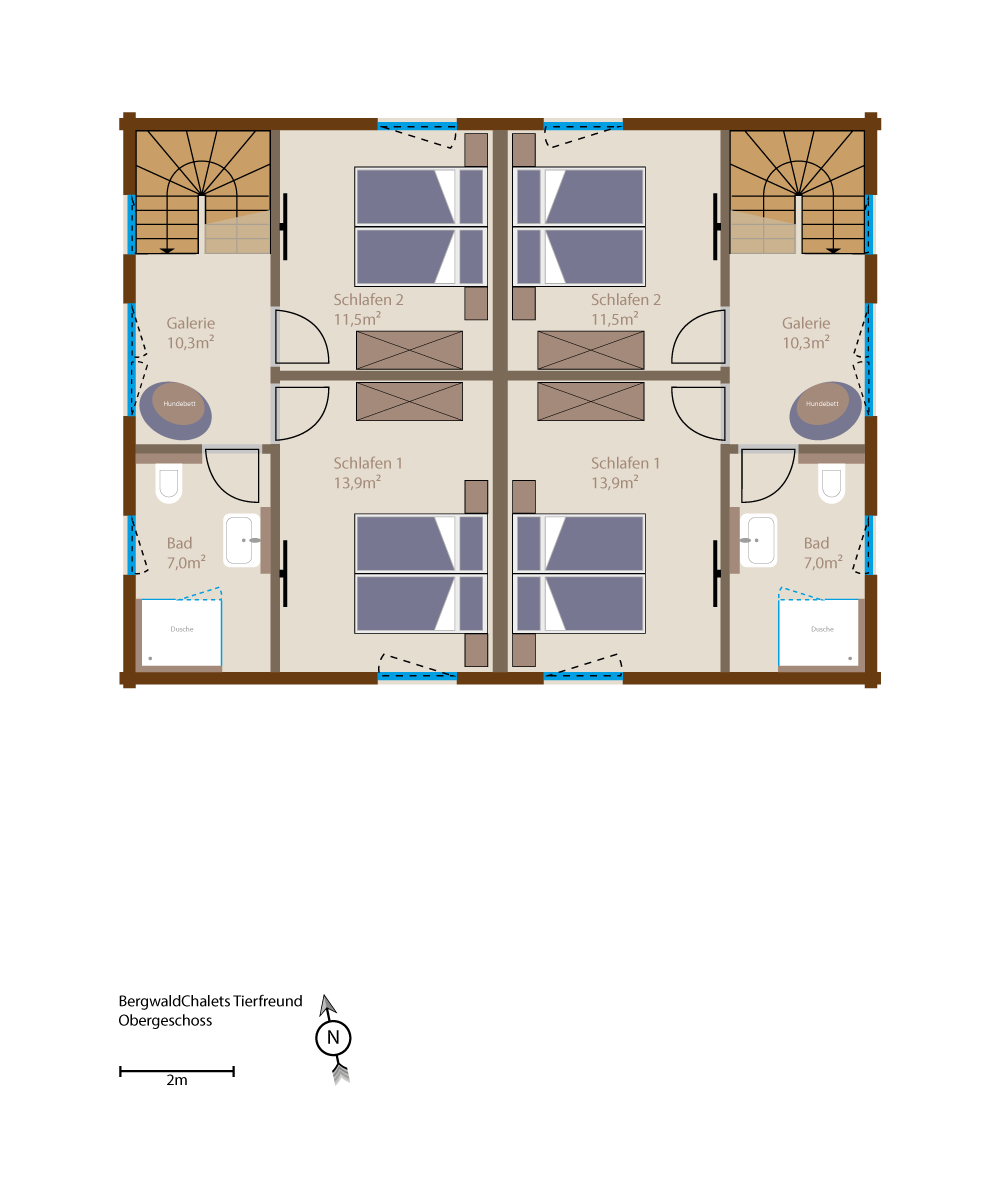 Die Chalets sind großzügig geschnitten, so dass Sie und Ihre Lieben - und natürlich auch Ihr Hund - sich frei bewegen können. Die Ausstattung wird von warmen Farbtönen dominiert und passt sich wunderbar an das, in den Ferienhäusern verarbeitete Holz an. Ob Sie sich im Wohn- oder Essbereich, in der hochwertig ausgestatteten Küche, in den beiden Schlafzimmern mit Boxspringbetten oder in einem der zwei Bäder mit Regendusche aufhalten - die Chalets werden ihrem Namen voll und ganz gerecht.