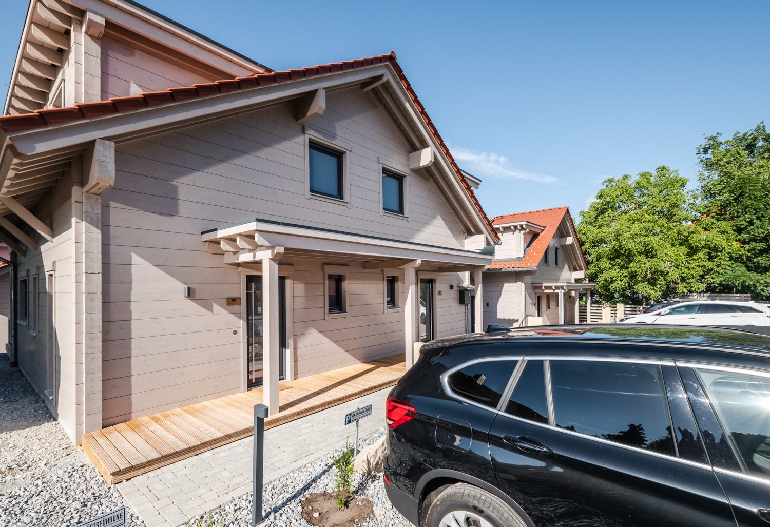 Zu jedem BergwaldChalet gehört ein PKW-Stellplatz mit einer Strom-Ladesäule.