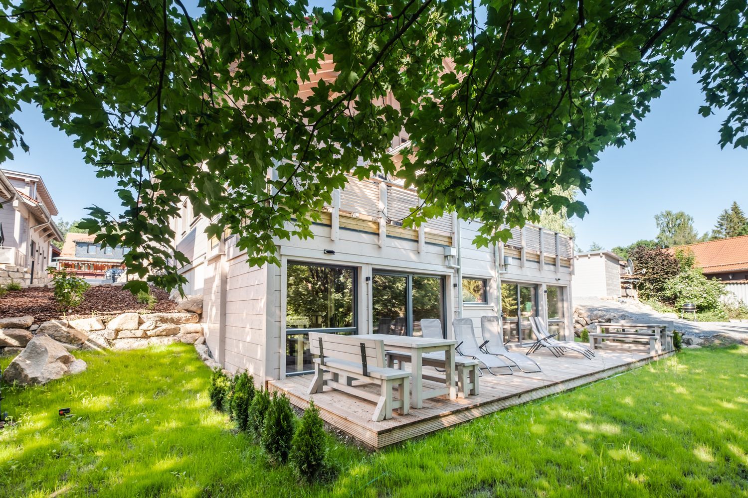 Terrasse mit Möbeln, Saunaliegen und Holzkohlegrill