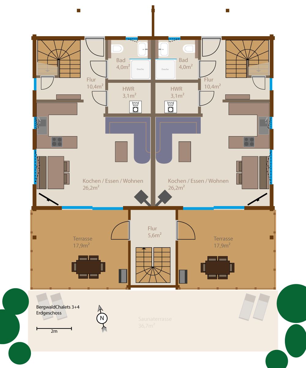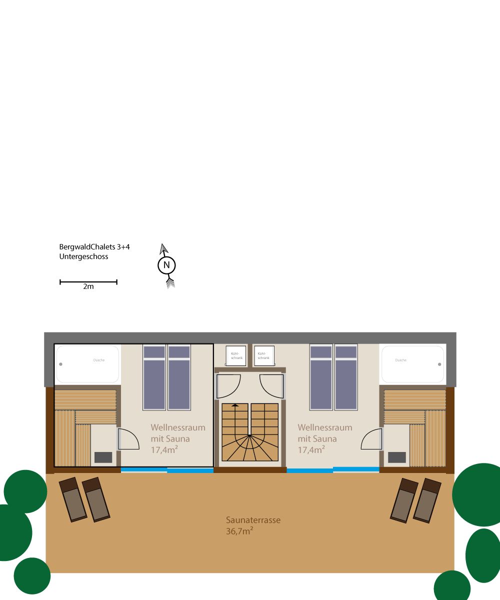 Ihr Highlight in diesen Chalets ist die voll ausgestattete Sauna unterhalb der großen Sonnenterrasse im Erdgeschoss. Die Vollglasfront ermöglicht unseren Gästen in der Sauna den "tiefen Blick in die Natur". Die Sauna-Pausen verbringen Sie dann in Ihrem Ruheraum oder auf der vorgelagerten Saunaterrasse. Komfortabel ist auch die große Walk in-Dusche zur Abkühlung nach dem Saunagang. Ein zusätzlicher kleiner Kühlschrank steht für Sie bereit und auch auf Musik müssen Sie im Wellnessbereich der BergwaldChalets nicht verzichten. Hier kann man das Leben genießen!