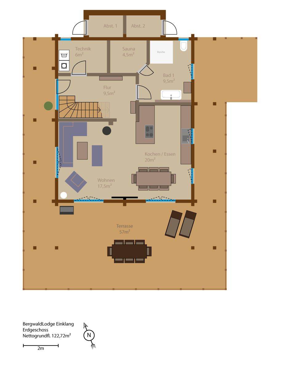 Der großzügige Wohn-, Koch- und Essbereich im Erdgeschoss der Lodge bietet Platz für Gemeinsames, aber auch genügend Freiraum, um einfach mal ein Buch zu lesen oder den Gedanken "freien Lauf" zu lassen.