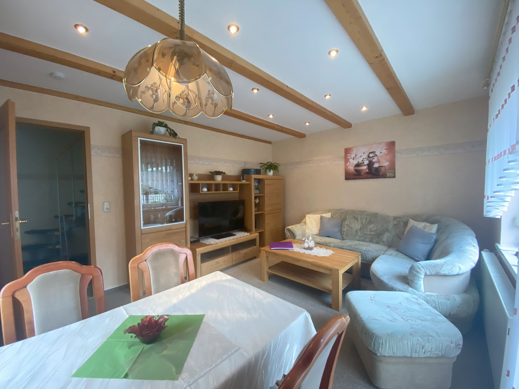 Wohnzimmer mit gemütlicher Couchecke, TV, DVD-/BluRay-Player und Esstisch