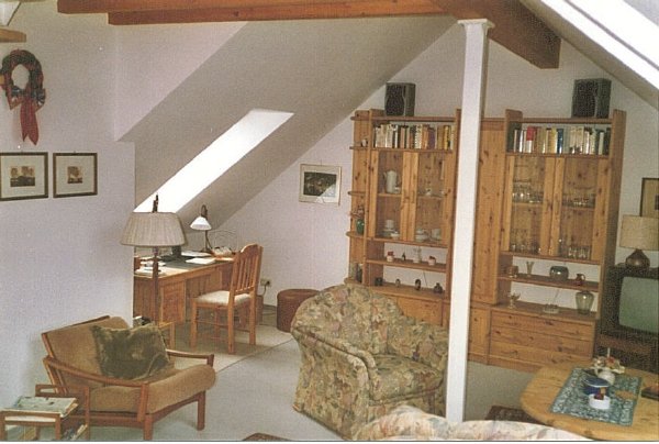 Wohnbereich mit 3-Sitzer-Couch, Zweisitzer-Sessel und einfachem Sessel, TV (älteres Gerät)