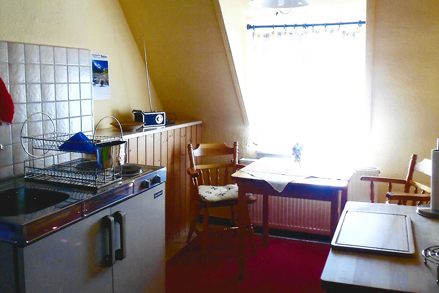 Küche mit zwei Herdplatten und Essecke