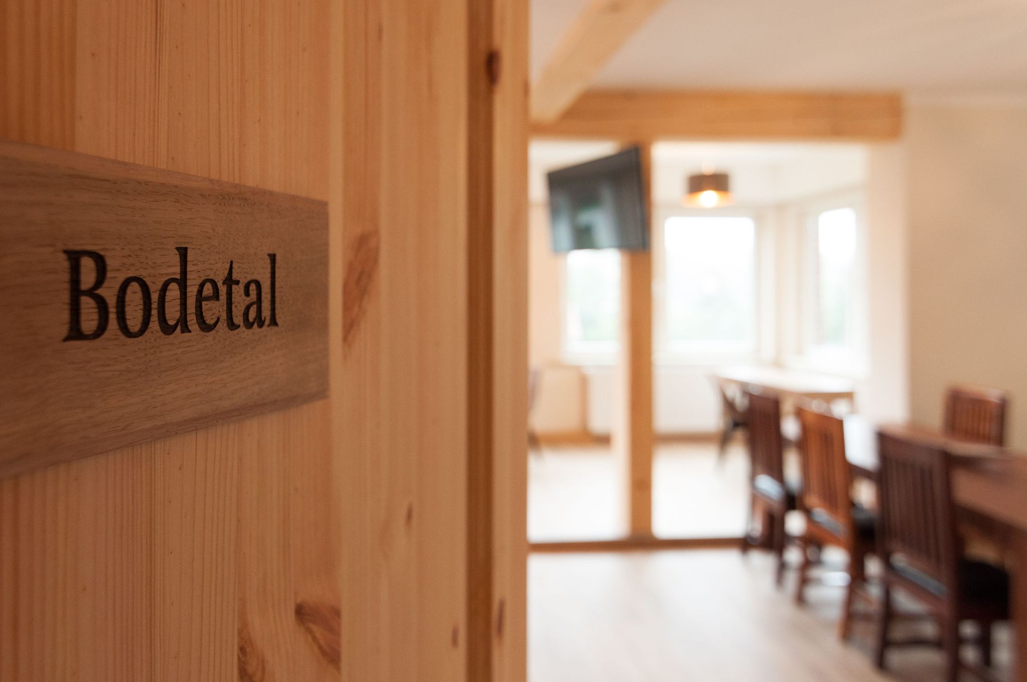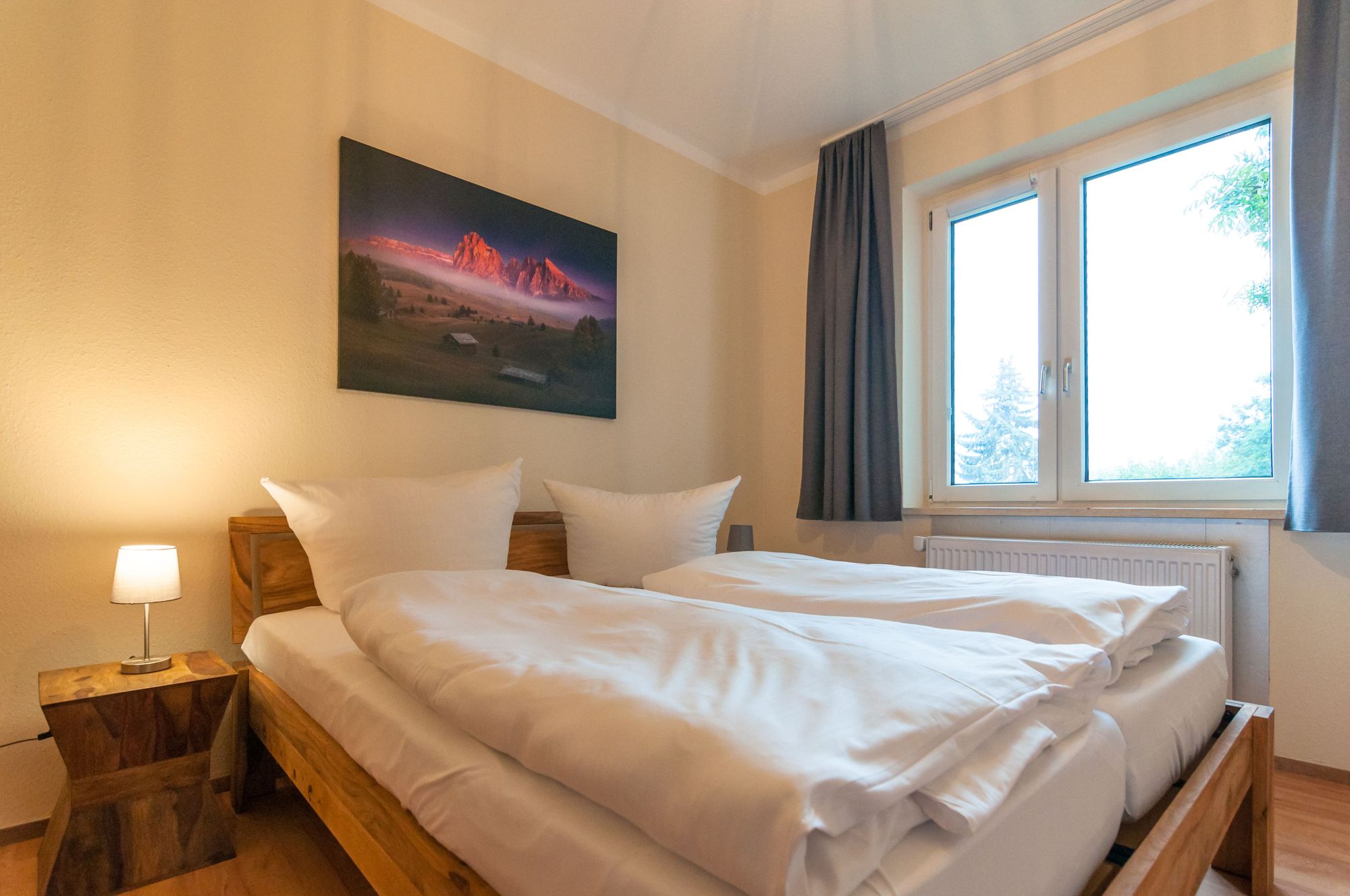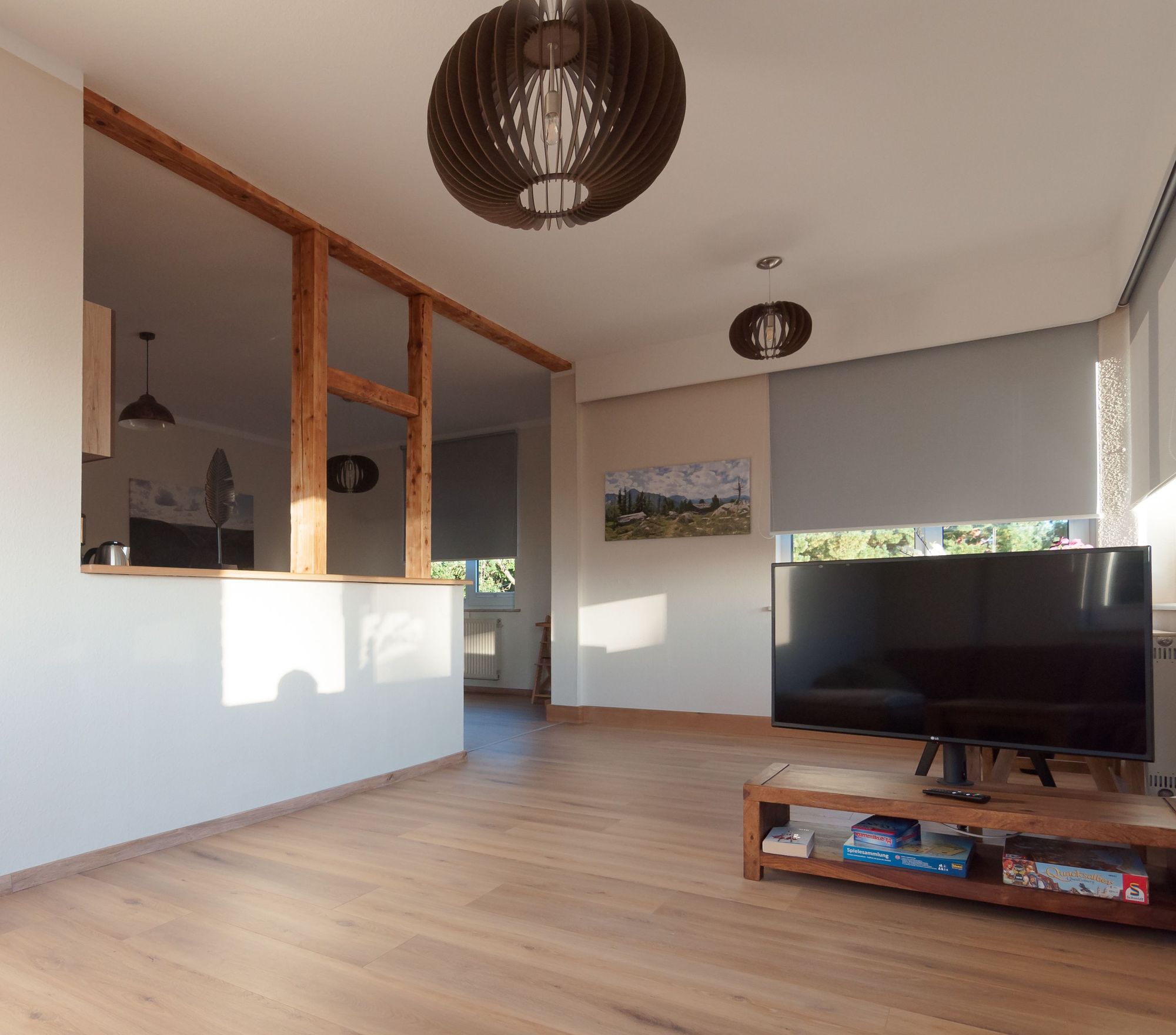 Die darunter liegende Ferienwohnung Bodetal im Hochparterre bietet zwei Schlafzimmer und ist für 4 Personen ideal. Auch hier wirken die Räume vom Wohnzimmer über die beiden Schlafzimmer bis hin zur Küche weitläufig und durch die großen Fensterfronten wunderbar hell.