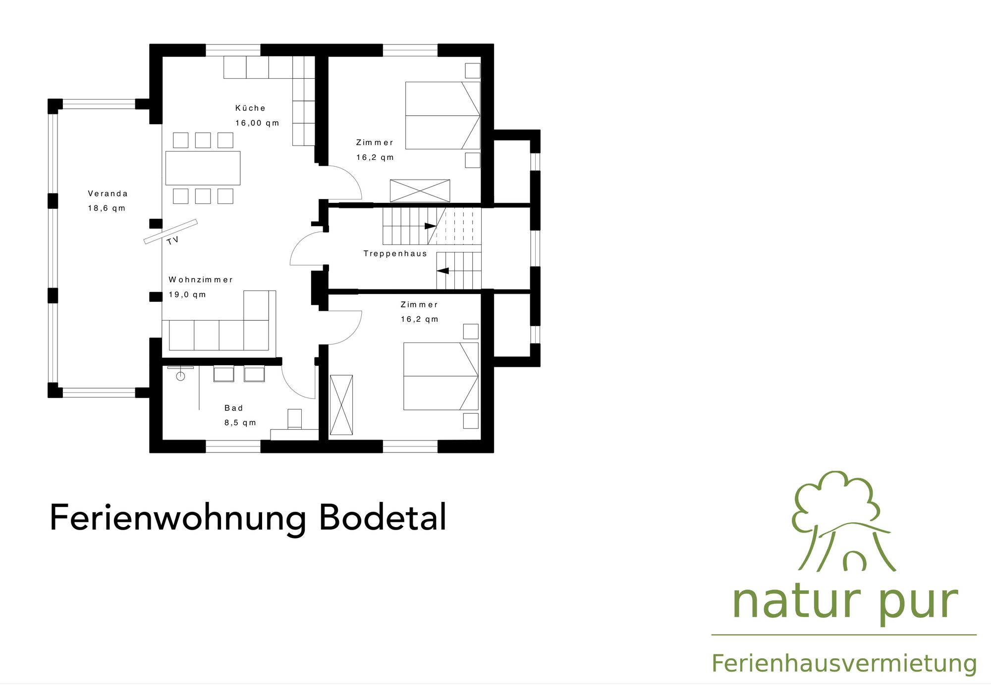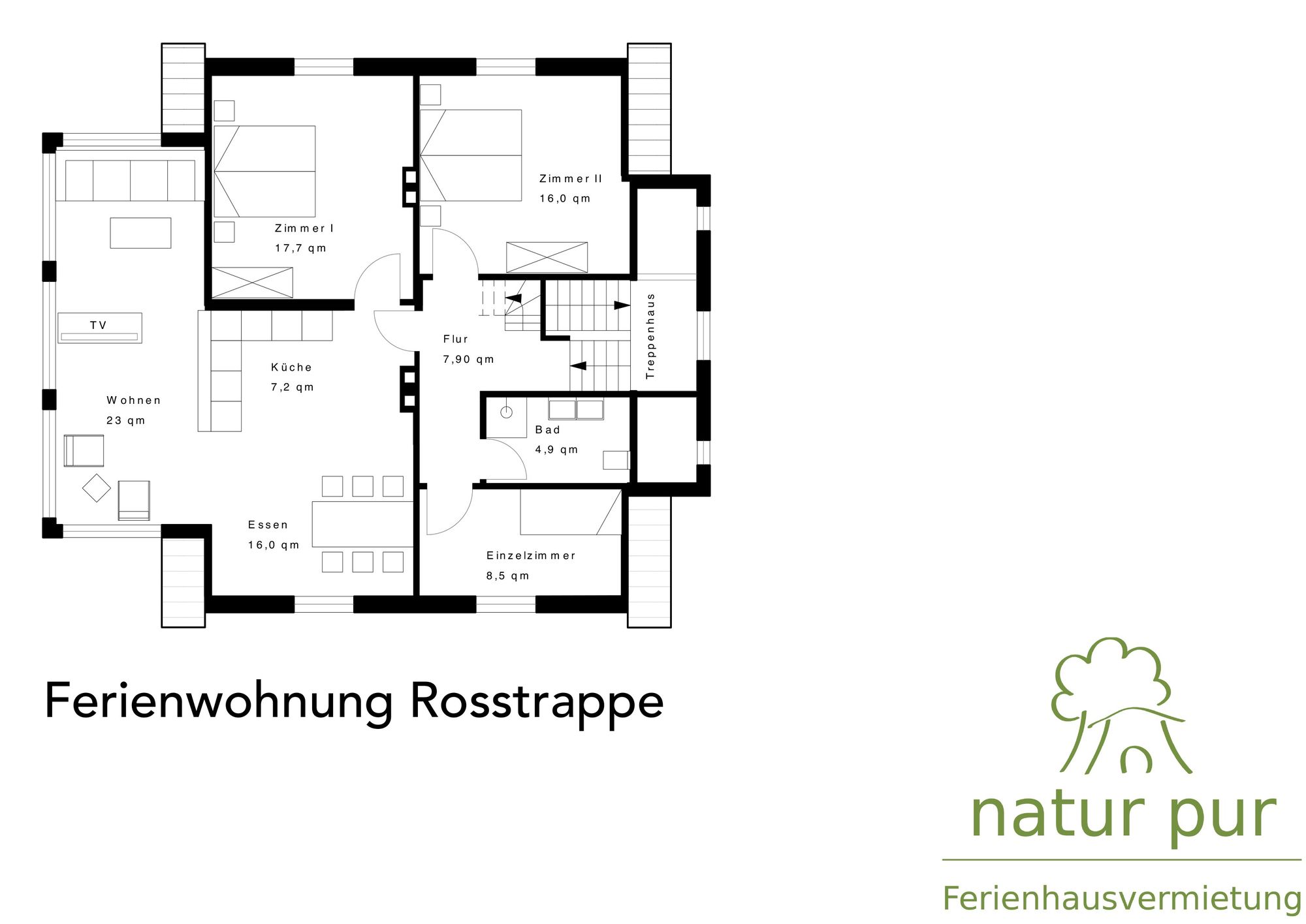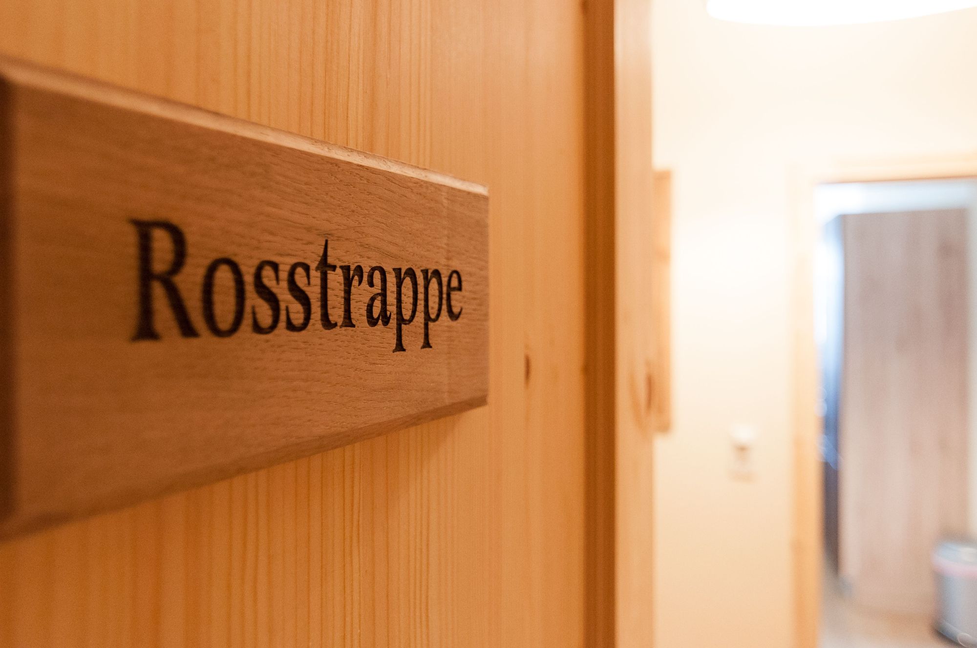 Die Ferienwohnung Rosstrappe ist für 5 Personen ausgelegt und ist im Obergeschoss des Hauses untergebracht. Das Wohnzimmer befindet sich in einer geschlossenen Veranda und wird am Tage aufgrund der durchgehenden Fensterfront vom Licht durchflutet. Bei sternenklarer Nacht kann man von hier aus sicher die eine oder andere Sternschnuppe beobachten. Durch die offene Küche bleibt man auch beim Kochen mit den Anderen in Kontakt. Die drei Schlafzimmer der Ferienwohnung und das Bad sind ebenfalls freundliche, helle Zimmer.