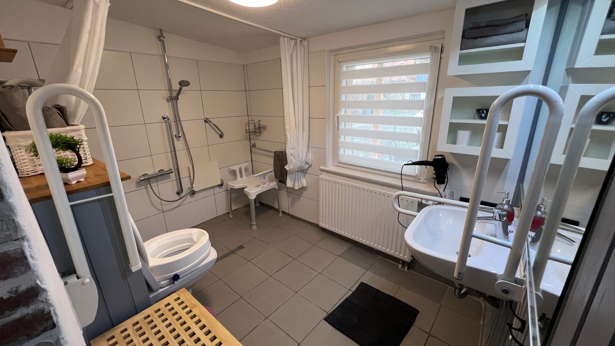 Das Badezimmer bietet viel Platz, so, dass Sie hier mit dem Rollstuhl in die Dusche oder unter das Waschbecken fahren können. In der Dusche sind sowohl ein hochklappbarer Duschsitz als auch ein Duschstuhl; an allen relevanten Punkten im Bad sind Haltegriffe angebracht. Das WC ist höhenverstellbar durch einen Aufsatz. Der Badspiegel ist groß genug, damit Sie sitzend oder stehend hineinschauen können.