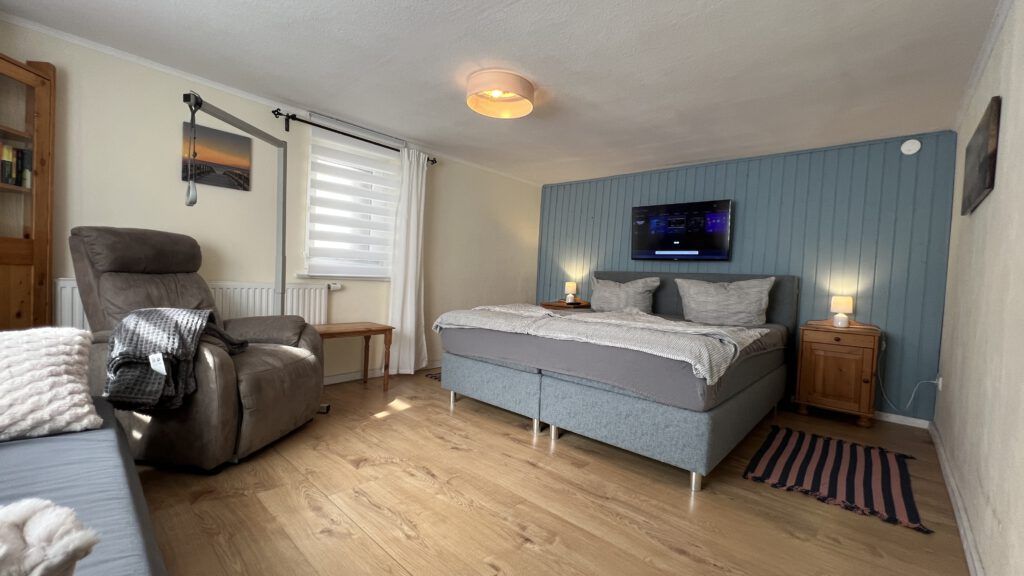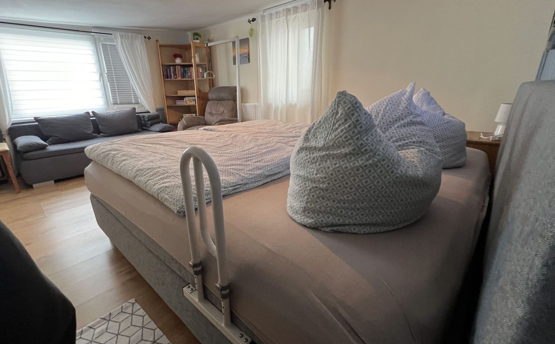 Vom kostenfreien Parkplatz bis zur Ferienwohnung sind es ca. 10 Meter Entfernung. Der Eingangsbereich ist 1 Meter breit und stufenlos, ebenerdig ist auch die gesamte Ferienwohnung. Der Wohn- und Schlafbereich ist so gestaltet, dass Sie sich hier mit einem Rollstuhl bequem fortbewegen können. Das bequeme Boxspringbett ist 56 cm hoch. Bei Bedarf stellen wir Ihnen gern ein Pflegebett zur Verfügung.
