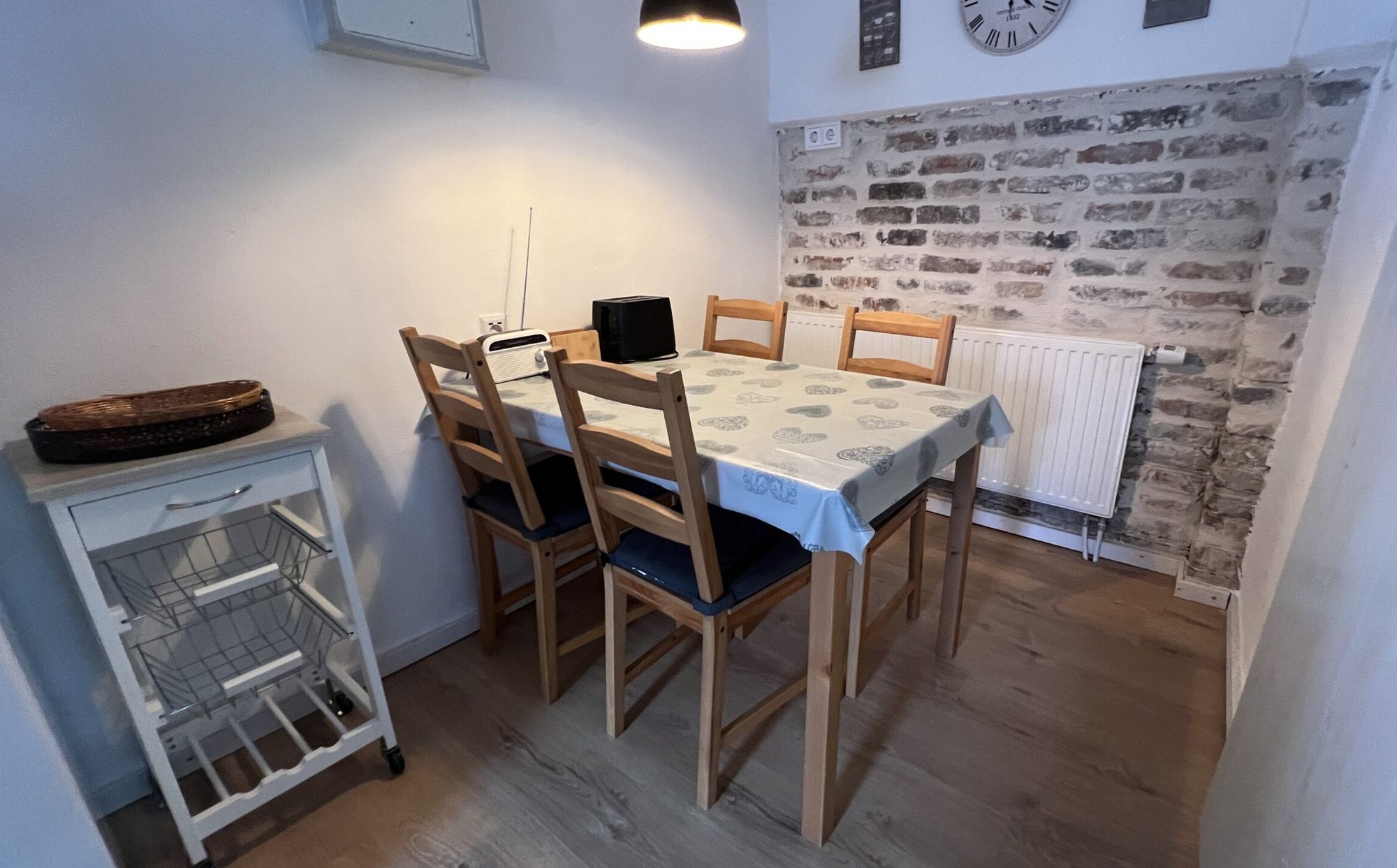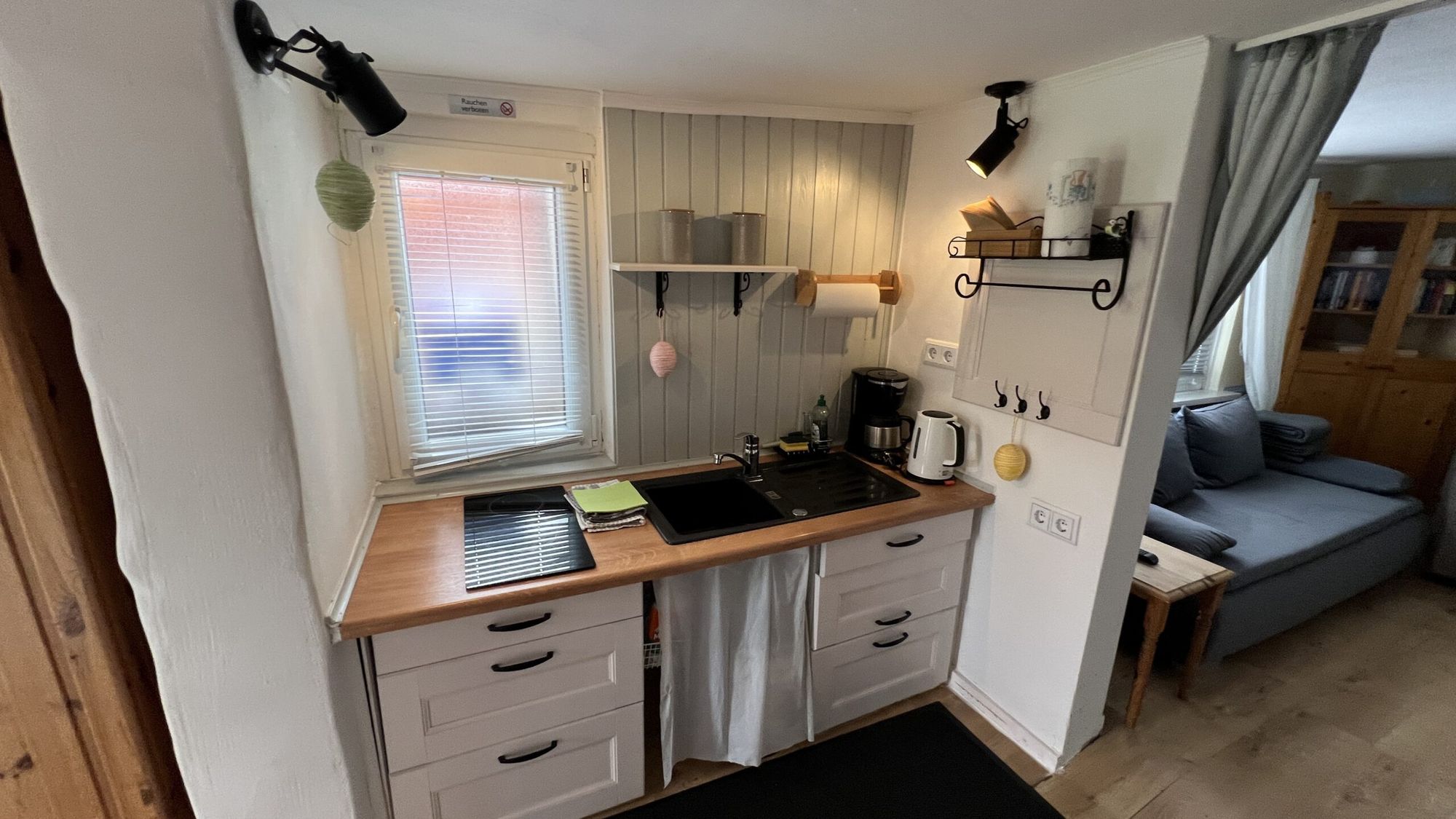 Kleine Küche mit 2-Felder-Kochfeld, Abwaschspüle, Mikrowelle, Kühlschrank mit kleinem Gefrierfach, Kaffeemaschine, Wasserkocher, Toaster, Radio, Esstisch für 4 Personen