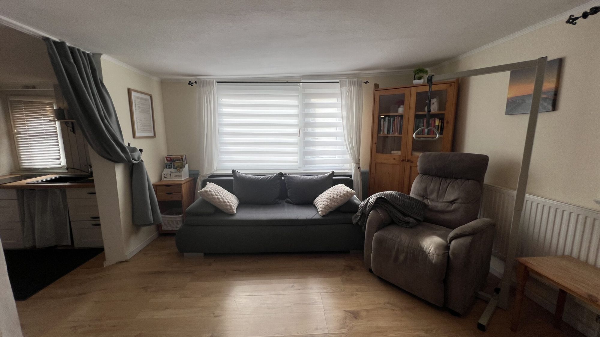 Kombinierter Wohn- und Schlafbereich mit Couch (Schlafsofa für Aufbettung), TV, Sessel mit Aufstehhilfe, Boxspring-Doppelbett mit Aufstehhilfe