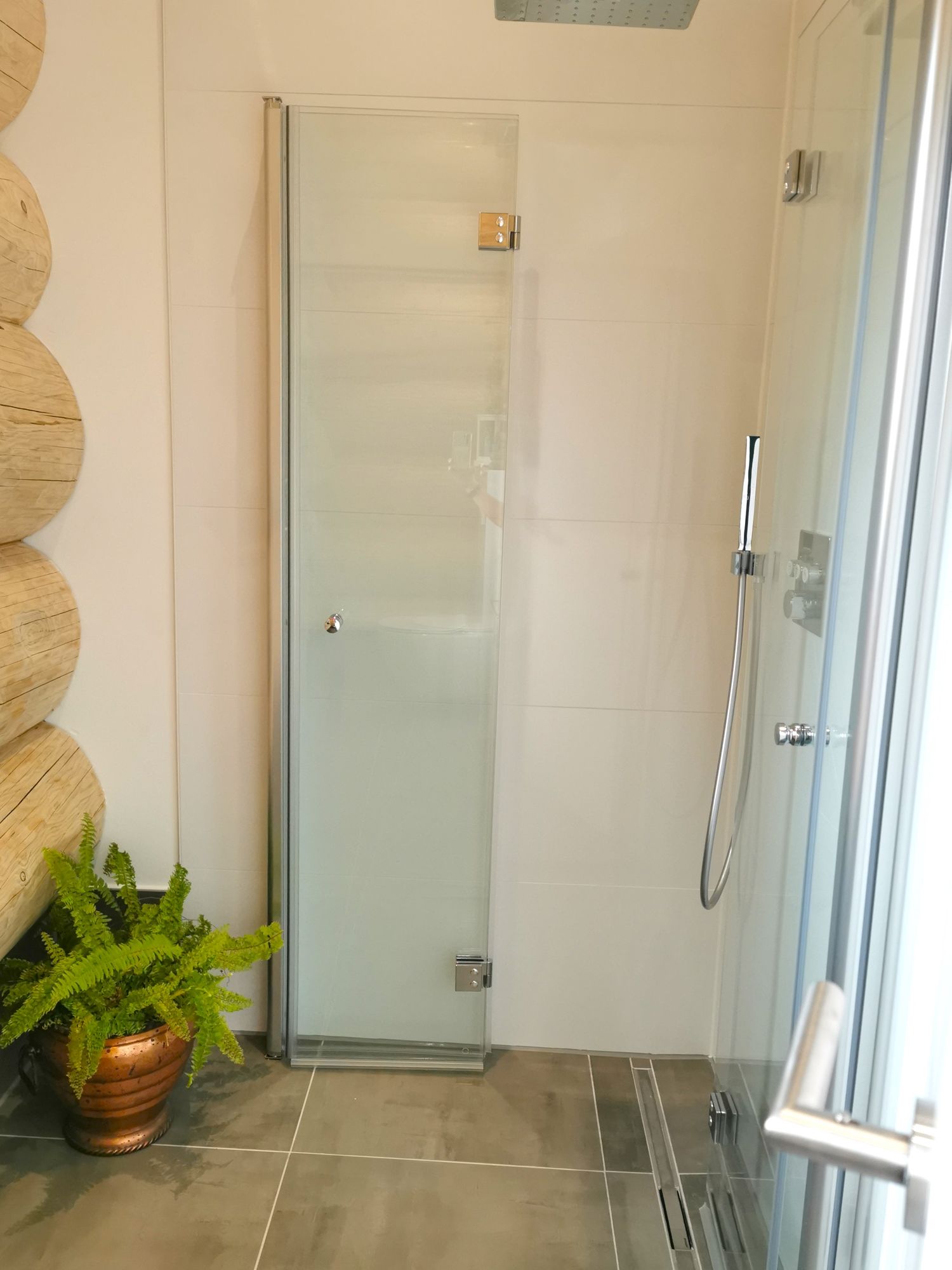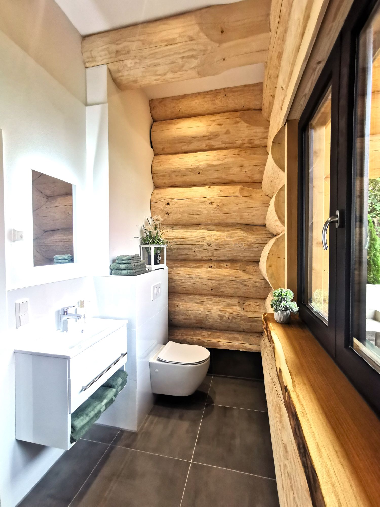 Badezimmer mit XXL Dusche, Waschtisch, WC und Fenster