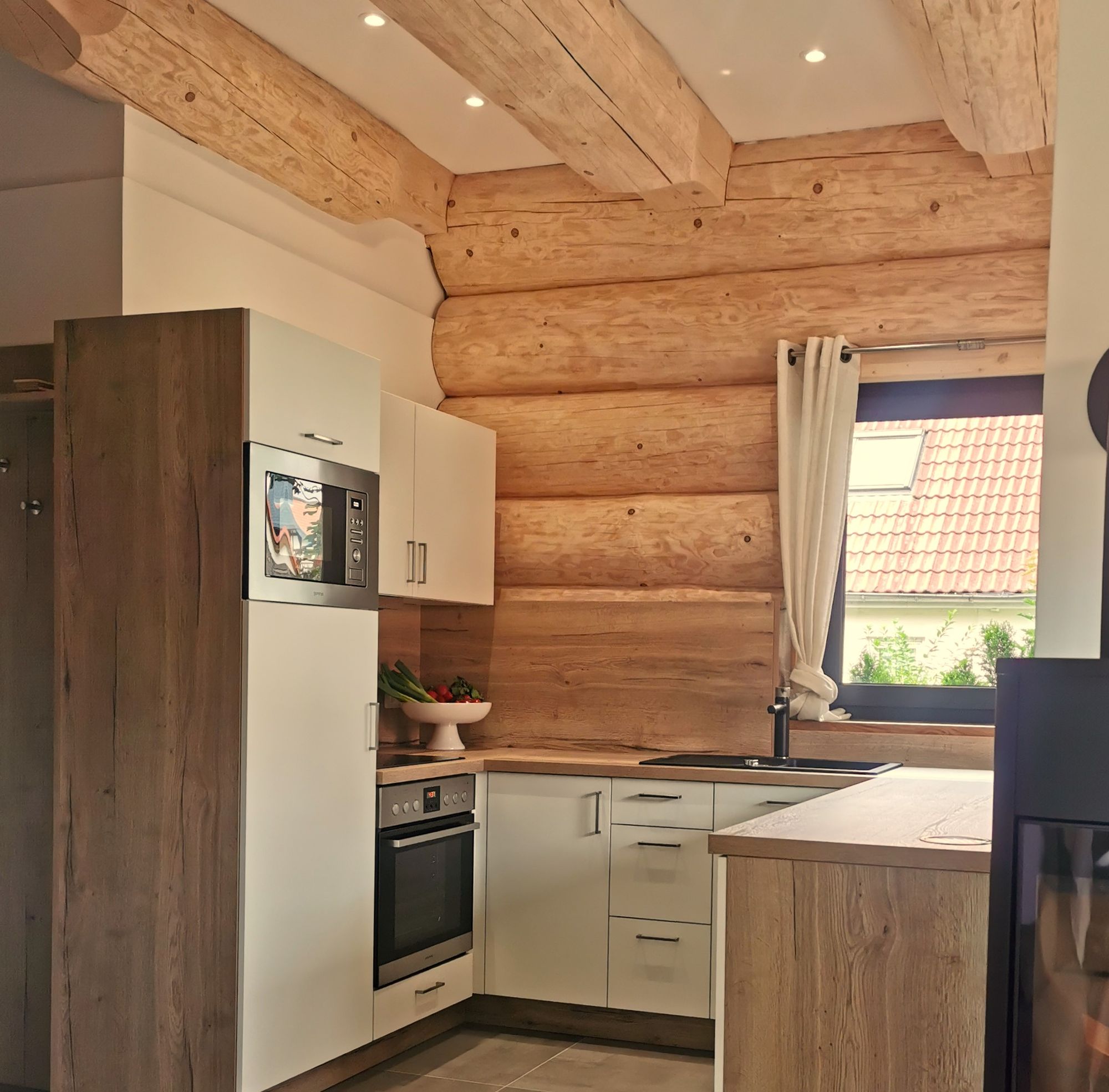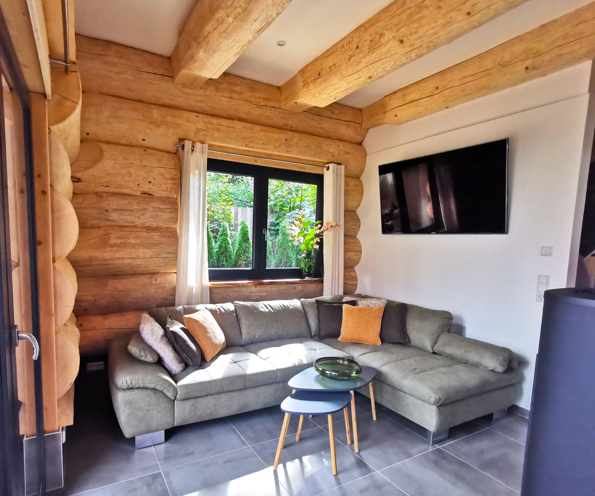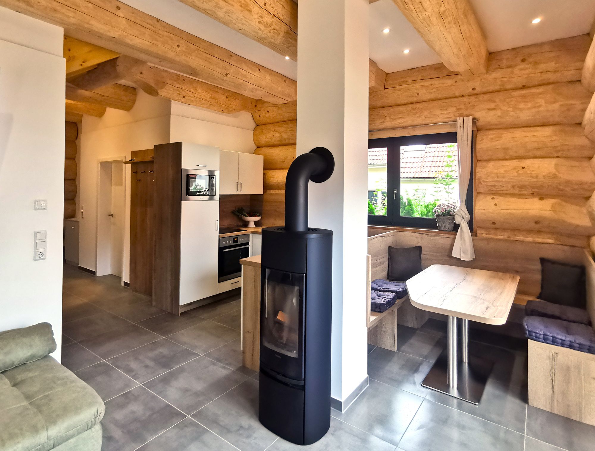 Das neu gebaute Blockhaus "Chalet 1" begrüßt Sie bereits mit einer hellen und großzügigen Optik im Wohn- und Kochbereich. Warme Holztöne bringen Harzer Gemütlichkeit und der Kamin trägt sein übriges dazu bei. Beim Kochen kann man mit den anderen Personen im Raum interagieren - egal, ob sie in den bequemen Couchmöbeln sitzen oder bereits voll freudiger Erwartung am Esstisch.