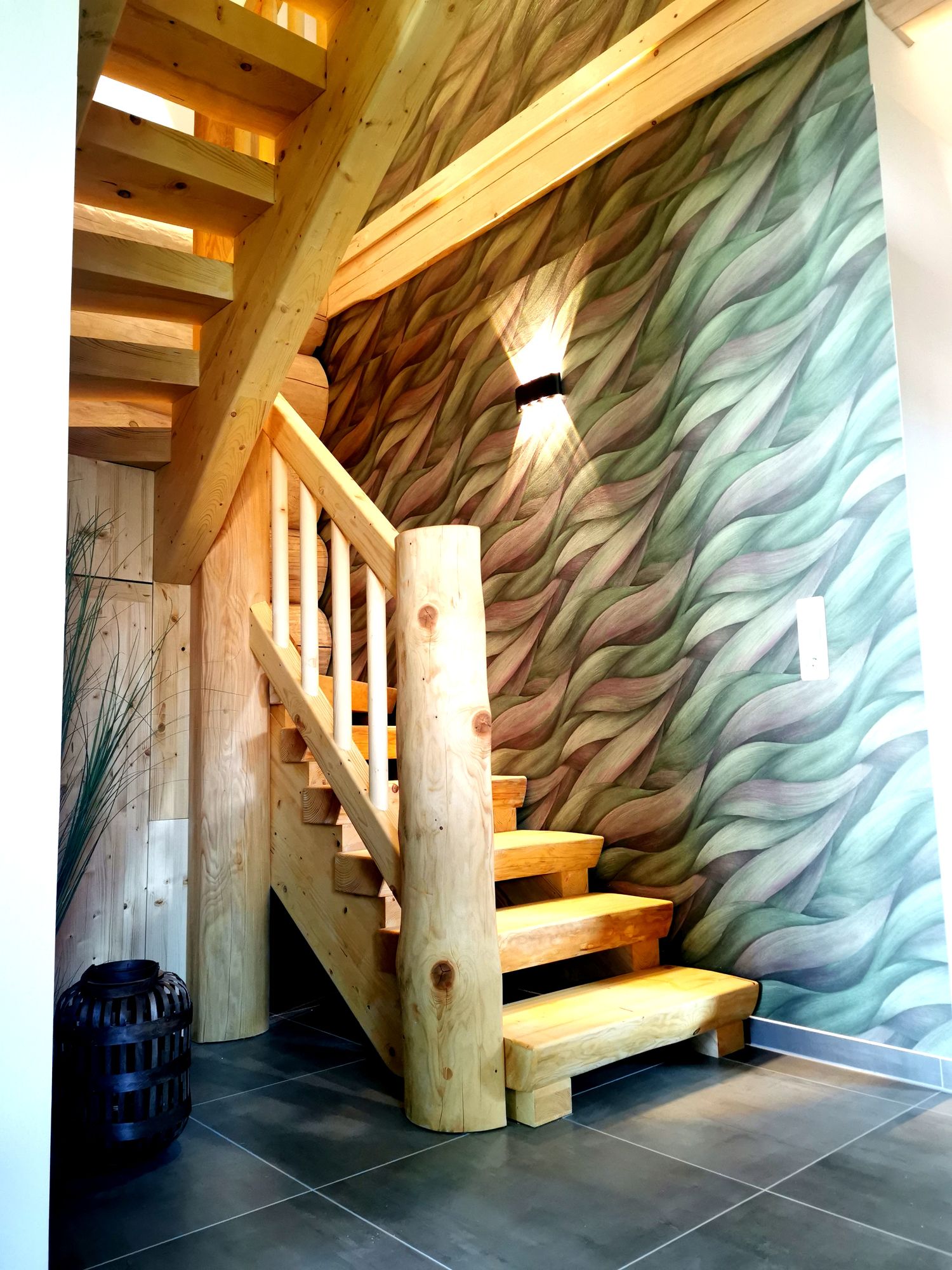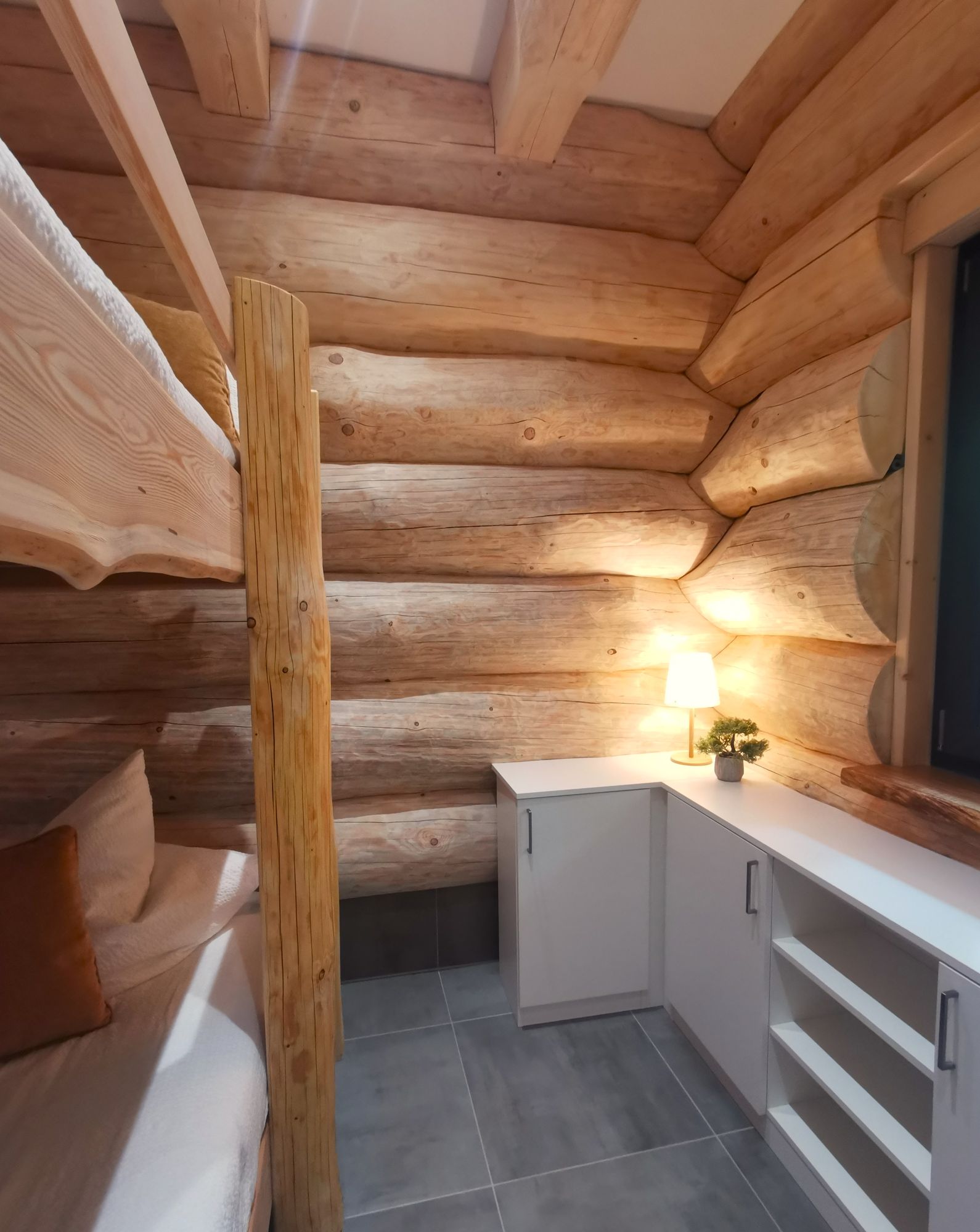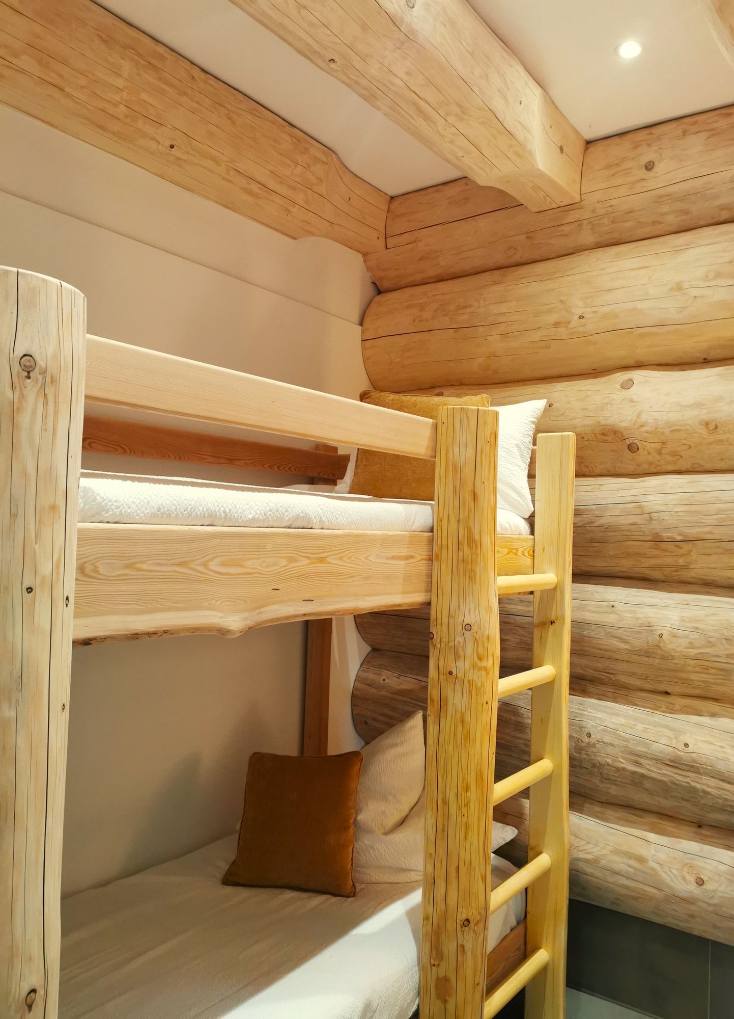 Im Erdgeschoss befinden sich neben dem offenen Koch- und Wohnbereich ein kleines Schlafzimmer mit urigem Blockbohlen-Doppelstockbett und ein Badezimmer mit bodenebener Dusche.