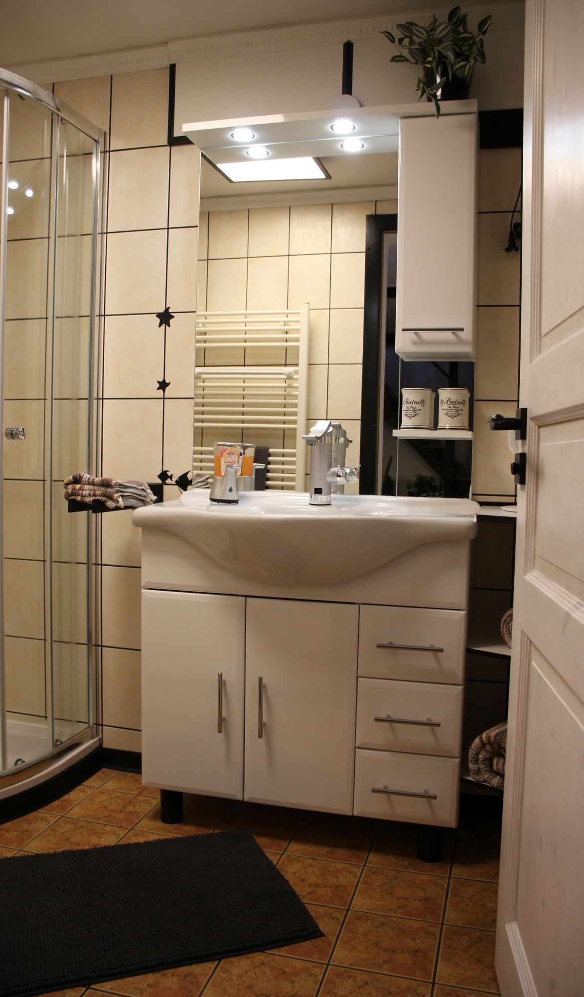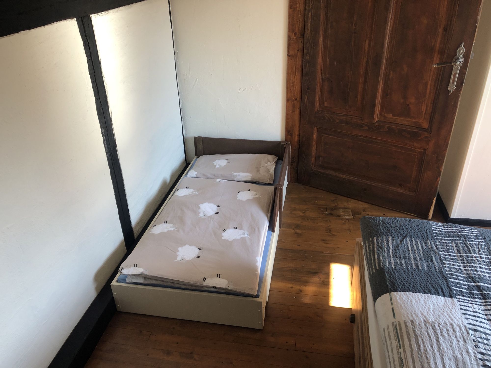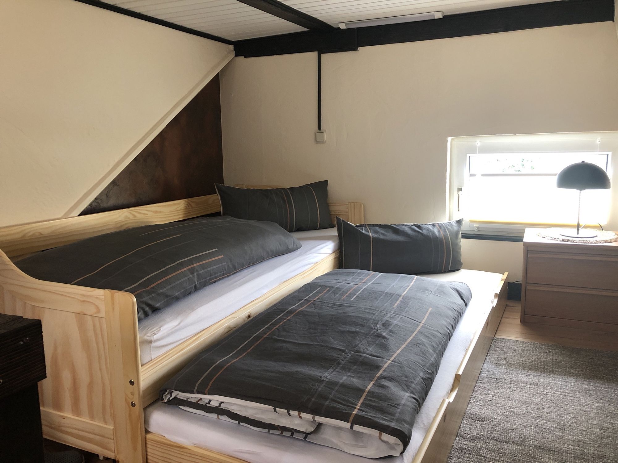 Die zwei Schlafzimmer bieten Komfort für 4 Personen. Bitte beachten Sie die niedrige Deckenhöhe von 1,60 m im zweiten Obergeschoss, die diesen Schlafbereich nicht weniger gemütlich macht. Allerdings ist das Stehen für größere Menschen hier eingeschränkt. Im Schlafzimmer mit Doppelbett kann zusätzlich und kostenfrei ein Kinderbett für ein Kleinkind eingestellt werden.