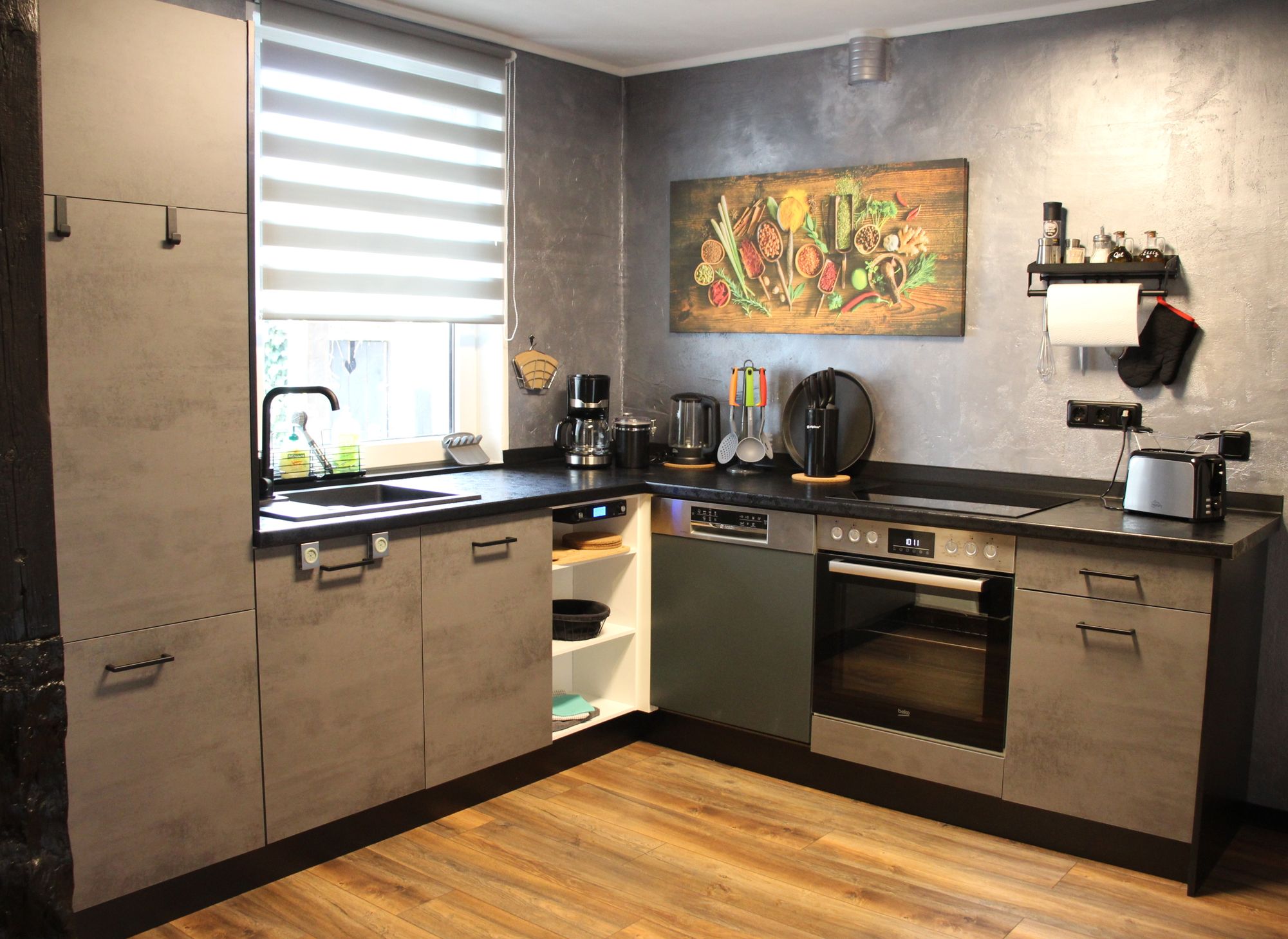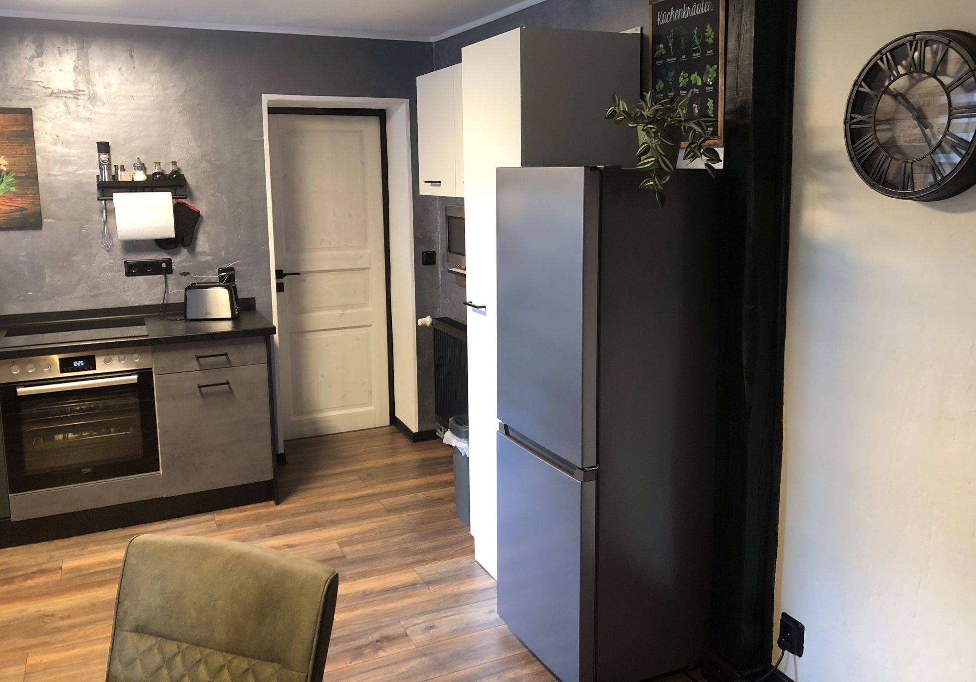 Voll ausgestattete Küche mit großen Kühl- und Gefrierschrank, 4-Felder-Cerankochfeld, Backofen, Geschirrspüler, Kaffeemaschine, Toaster, Wasserkocher