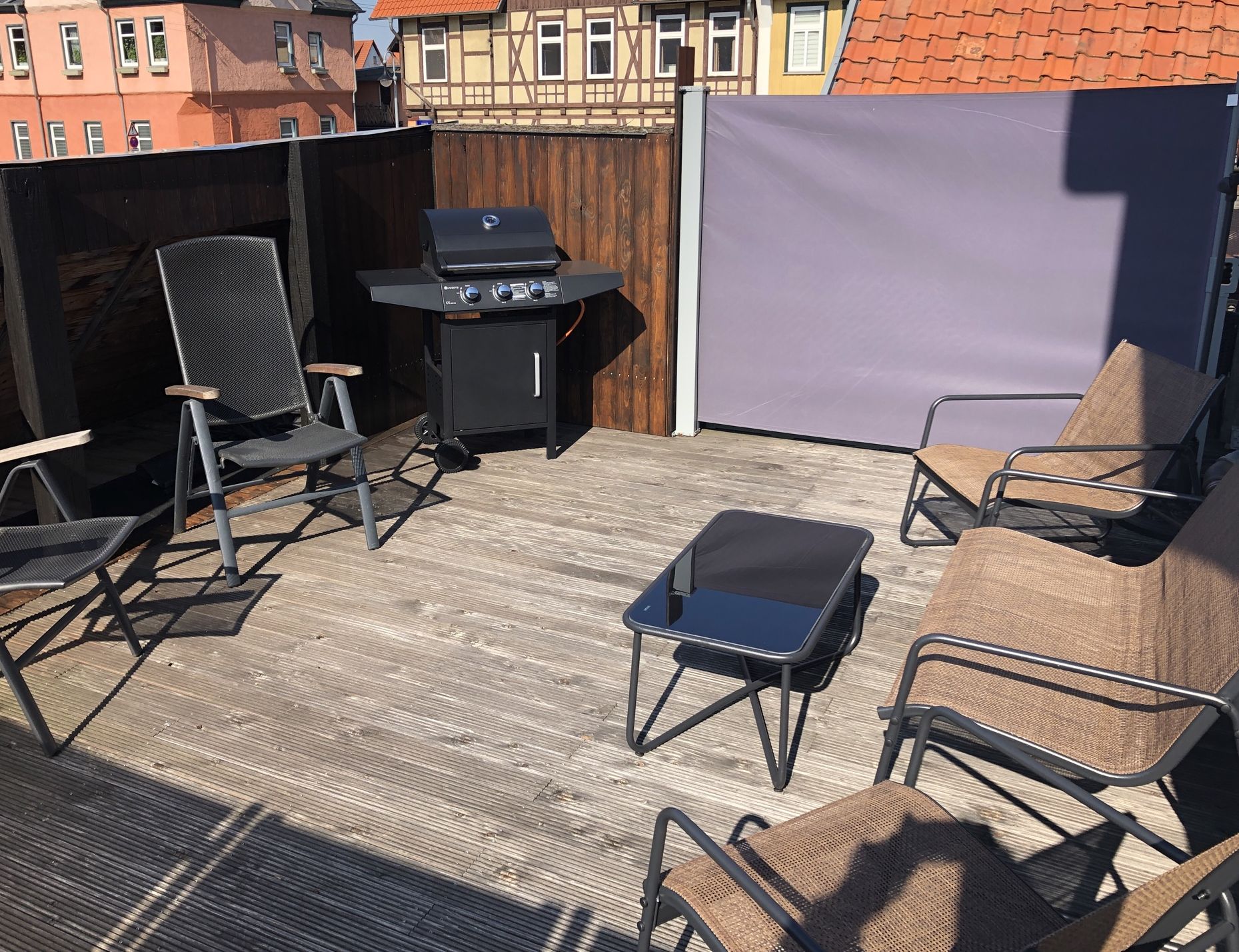 Abgeschlossene Terrasse im 1. Obergeschoss mit Sitz- und Grillmöglichkeit