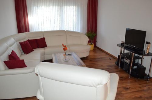 Wohnzimmer mit großer Lederfunktions-Eckcouch (zum Schlafen geeignet), Sessel, Drehhocker, Sat-TV mit Flachbildschirm, Hifi-Anlage