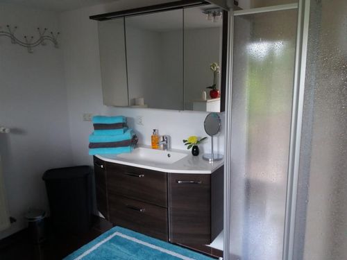Badezimmer mit Dusche (flacher Einstieg), WC, großem Badschrank mit Spiegel, Kosmetikspiegel, Fön