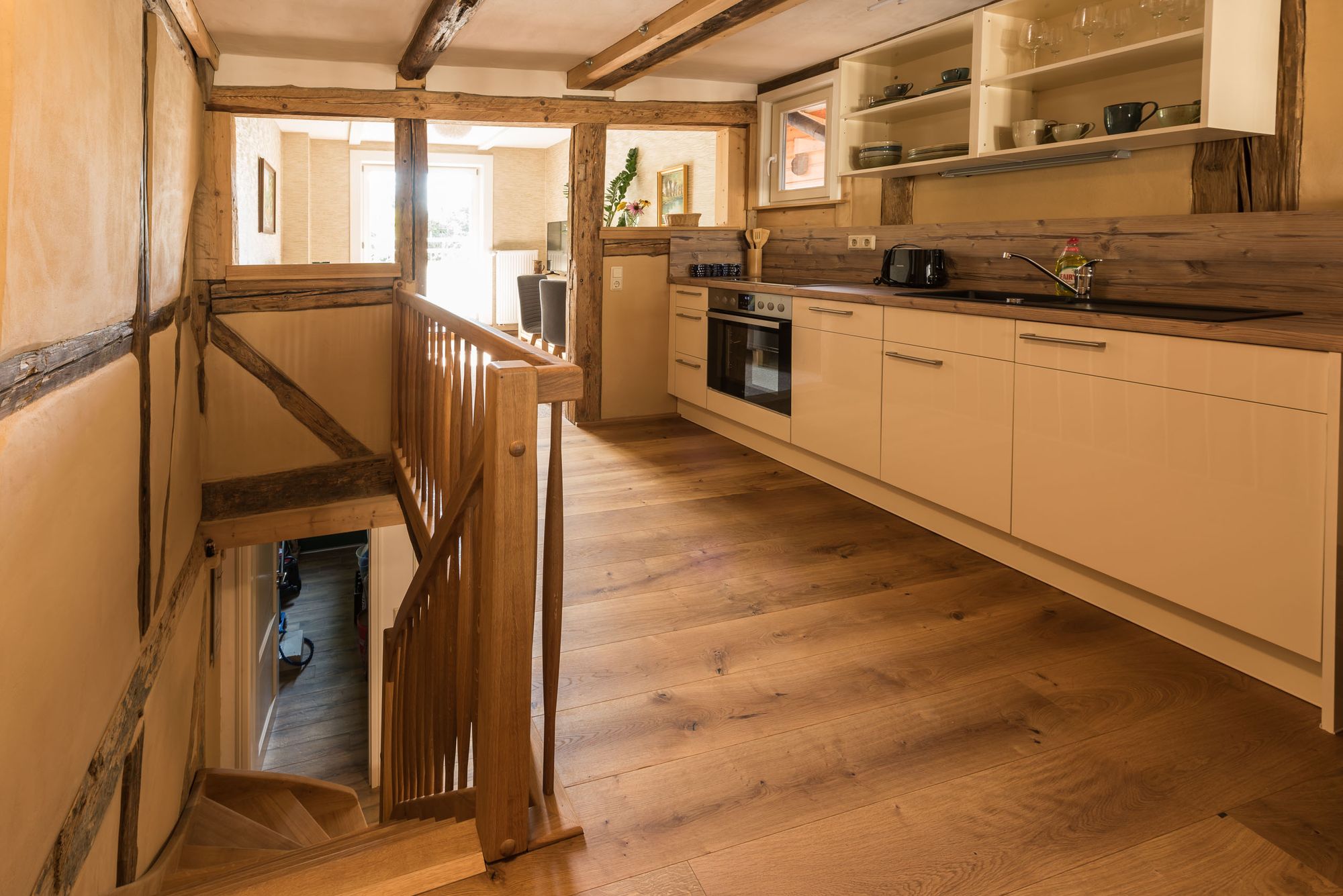 Das Besondere an dieser Etage sind die offen gelegten Fachwerkbalken zwischen den einzelnen Räumen, die eine unverwechselbare Atmosphäre ausstrahlen und einen freien Blick auf die gesamte obere Etage bieten.
