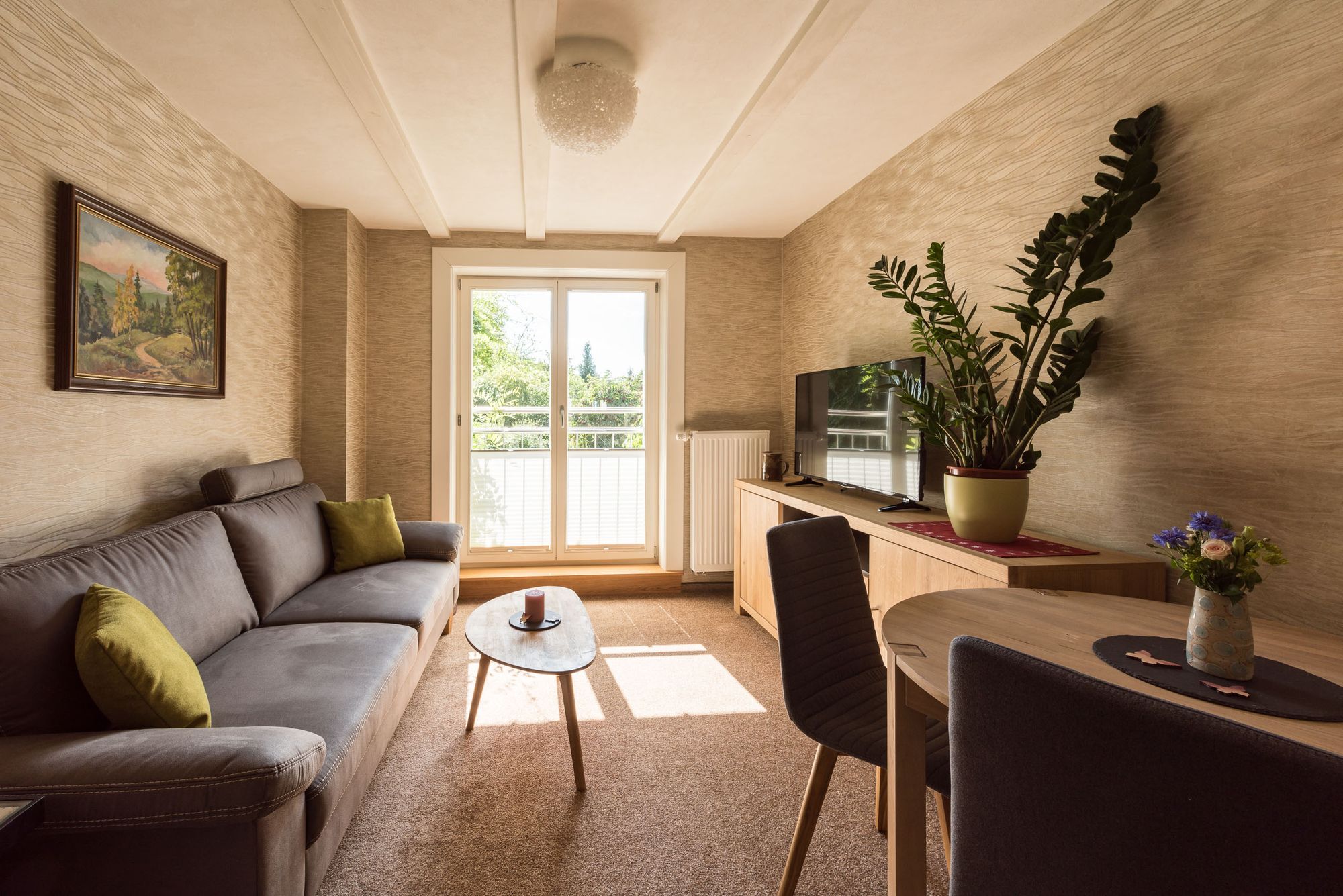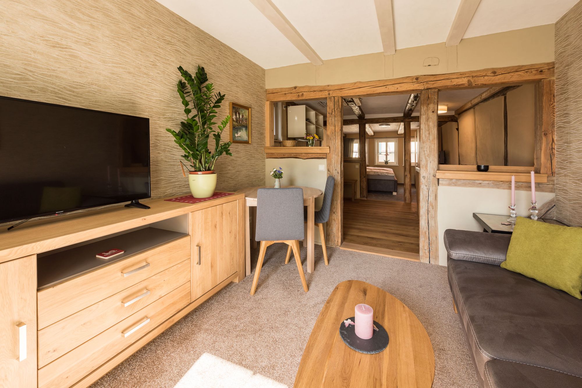 Wohnzimmer mit gemütlichem Sofa, kleiner Essecke und LED-TV