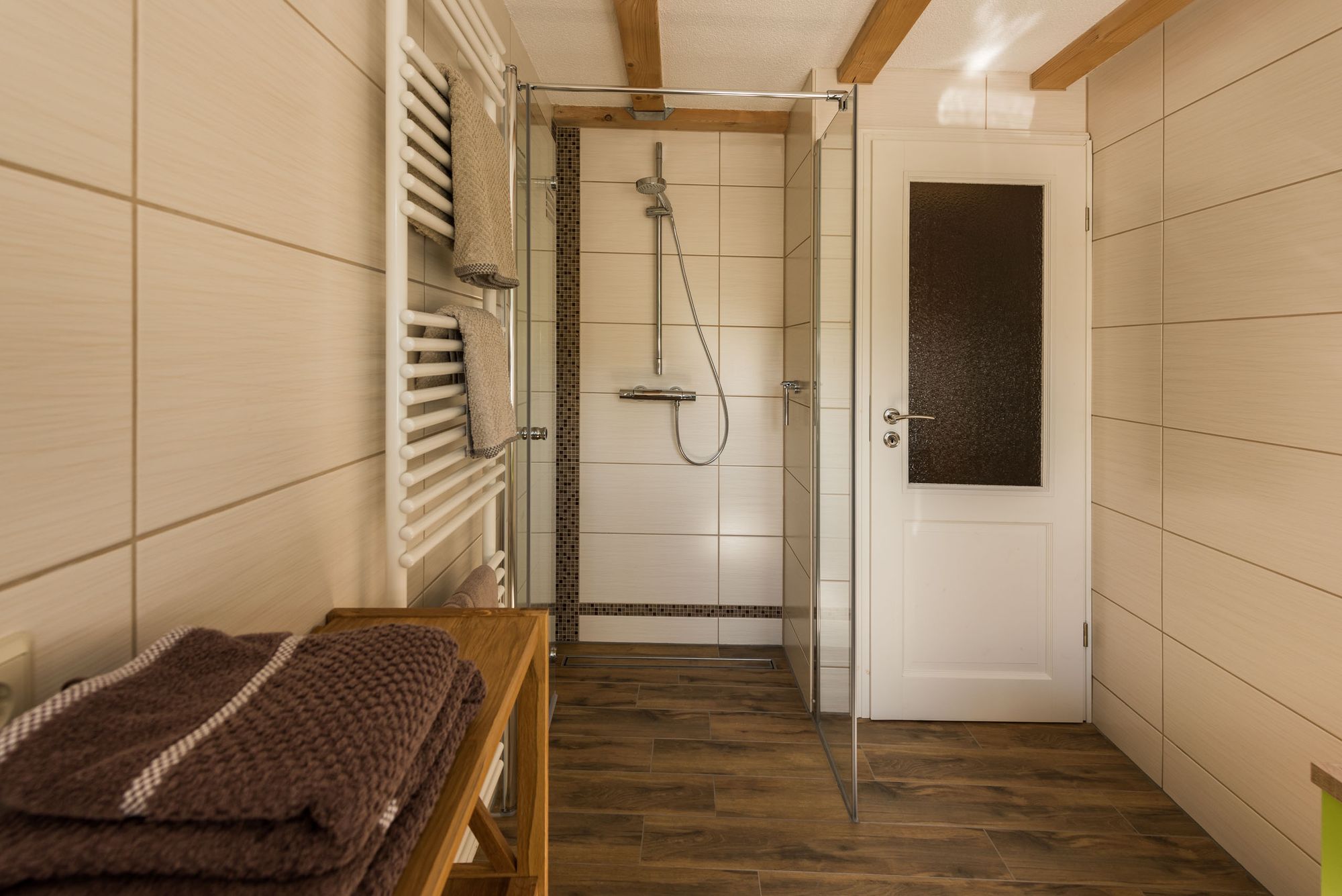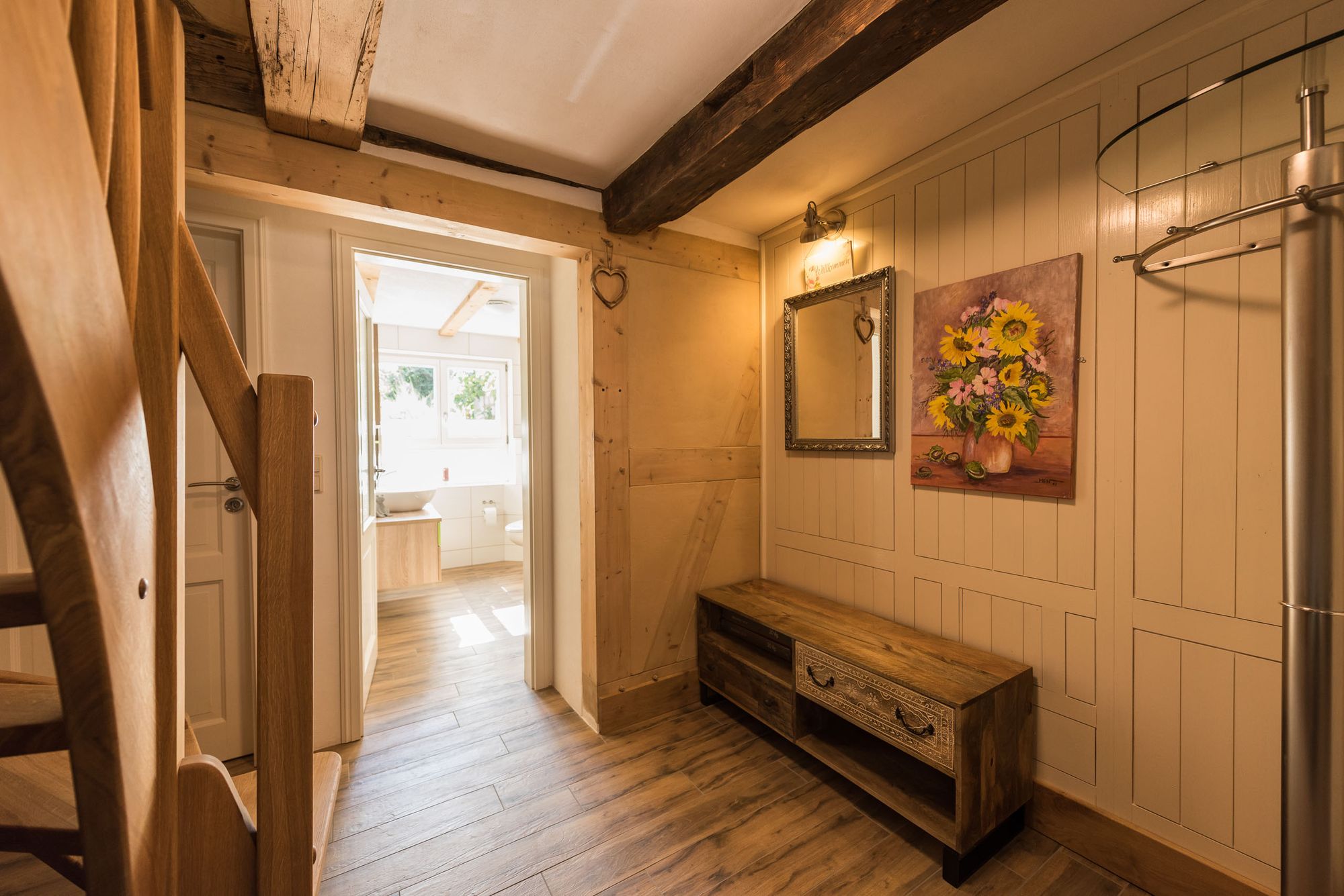Über einen separaten Hauseingang gelangen Sie in die Diele der Ferienwohnung mit einem gesonderten Abstellbereich für Fahrräder, die Sie für schelle Besorgungen in der Stadt oder Ausflüge in die Umgebung nutzen können. In dieser Etage finden Sie zudem das lichtdurchflutete Wohlfühlbad mit ebenerdiger Dusche.