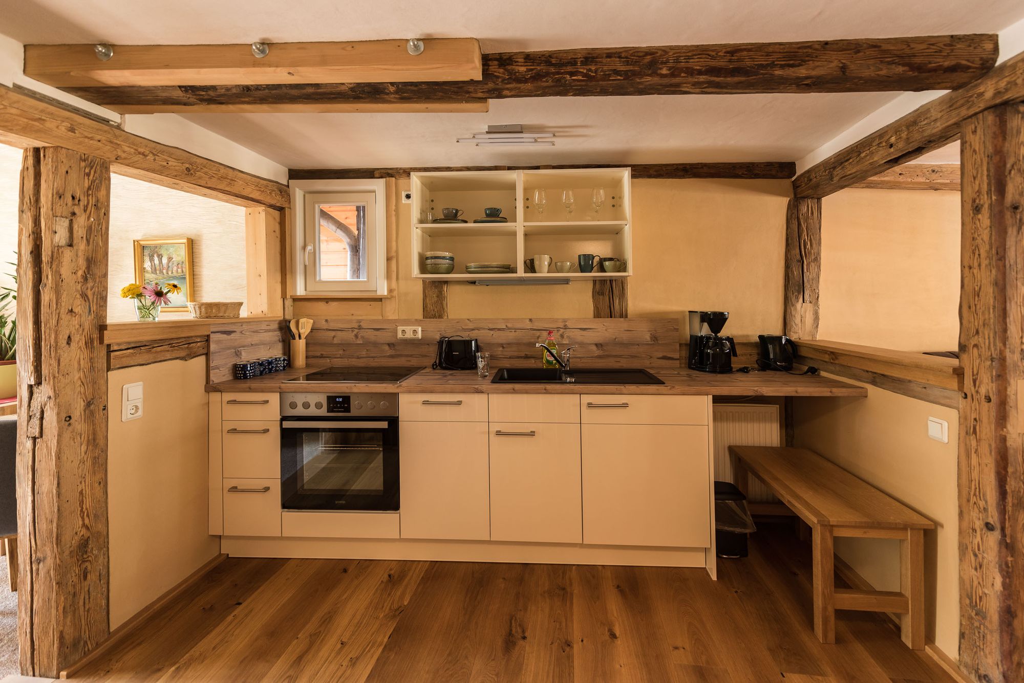 Voll ausgestattete Küche mit 4-Feld-Cerankochfeld, Backofen, Kühlschrank, Kaffeemaschine, Toaster, Wasserkocher (keine Mikrowelle)