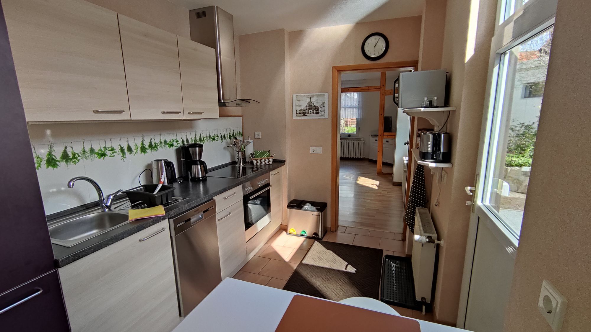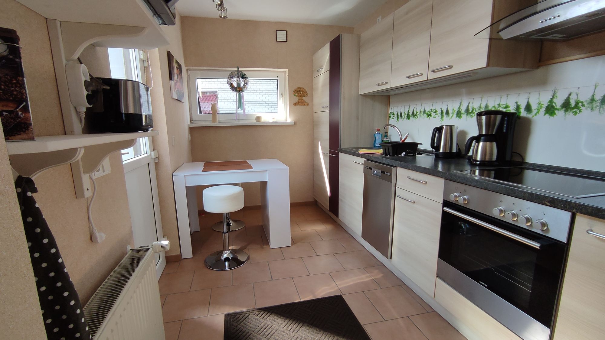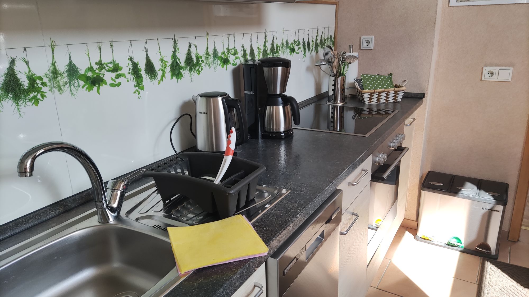 Voll ausgestattete Küche mit viel Platz und 4-Felder-Kochfeld (Ceran), Backofen, Kühlschrank mit Gefrierfach, Geschirrspüler, Mikrowelle, Kaffeemaschine, Wasserkocher, Toaster