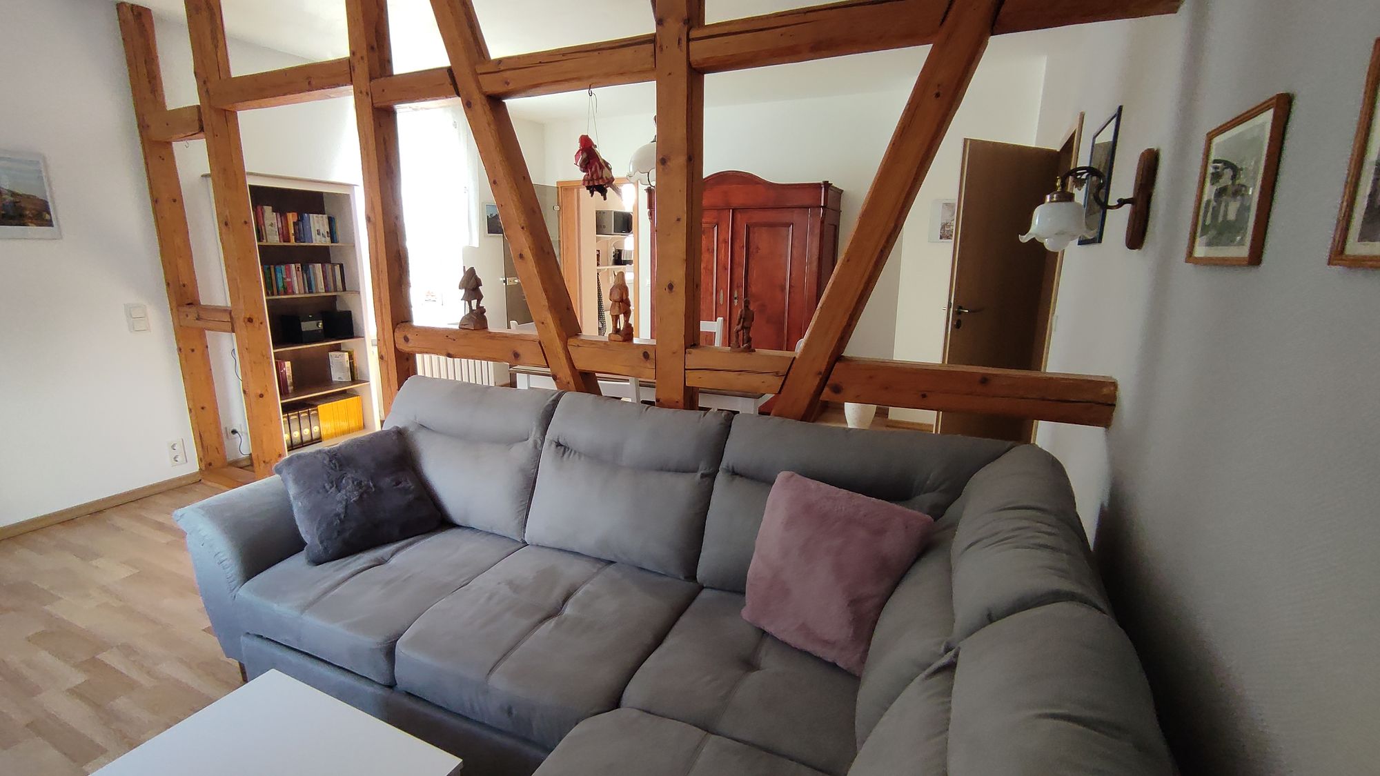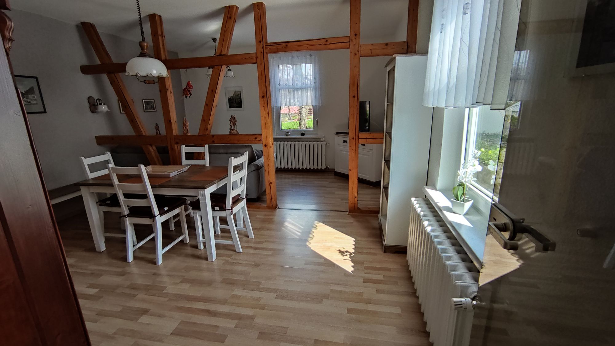 Offenes Wohn- und Esszimmer mit Trennung durch Fachwerkbalken